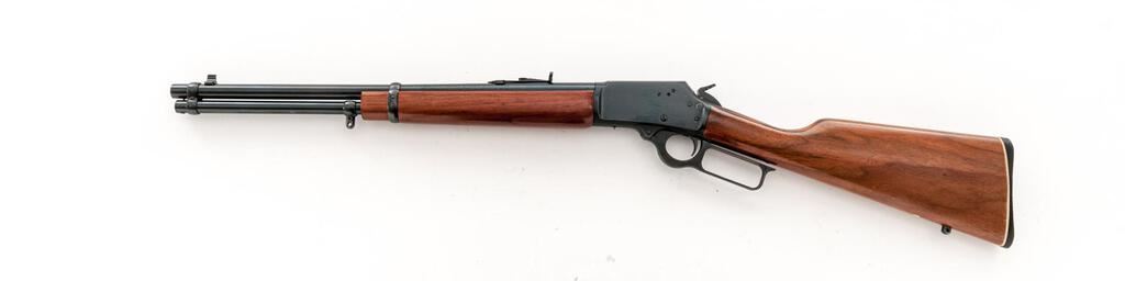 Marlin Model 1894 CS Lever Action Carbine, #11091635, .357 Mag./.38 Spec. cal., 18.5" micro-groove round barrel with full-length magazine, brass bead blade front and folding semi-buckhorn rear sights, blue finish, smooth wood two-piece straight grip stock with sling eyes and a checkered plastic Marlin marked buttplate. Mfg'd 1989. Carbine is in excellent overall condition retaining approx. 96%-97% factory blue finish with light handling marks. Markings are sharp with a nice "JM" on the barrel. Top of receiver is factory drilled and tapped with the tap screws retained. Smooth wood stock has a couple small mars and a half-inch compression on the right side at the tang. Action is crisp, bore is very good with sharp rifling. Popular with the Cowboy action shooters, these carbines were discontinued in 2015. Est.: $900-$1,200. (Modern)