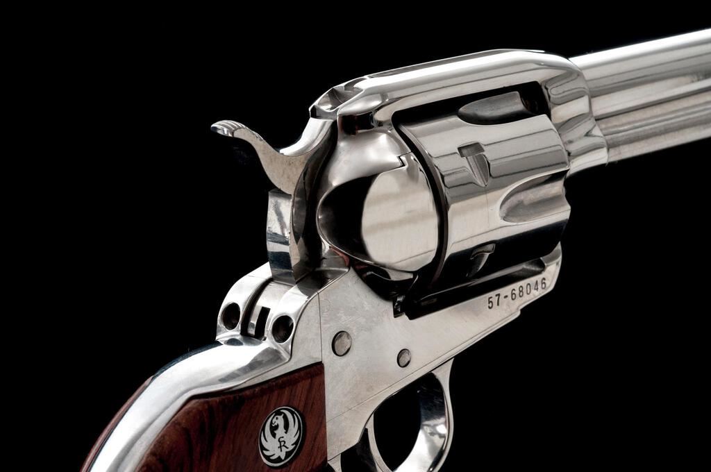 Ruger Vaquero Single Action Revolver, #57-68046, .357 mag. cal., 5.5'' barrel, high-gloss stainless finish, smooth hardwood grips with Ruger silver eagle medallions, and standard fixed sights. In original gray plastic case with matching numbered end label and gun lock. Condition is near excellent. Metal surfaces with light scratching and small handling marks, typical of high-gloss stainless finishes. Factory lettering is crisp. Grips show only minor use. Cylinder with a light index line; chambers are clean, cylinder face with normal powder burn marks. Crisp tight action, bright bore with excellent rifling. Est.: $700-$900. (Modern/Exempt)