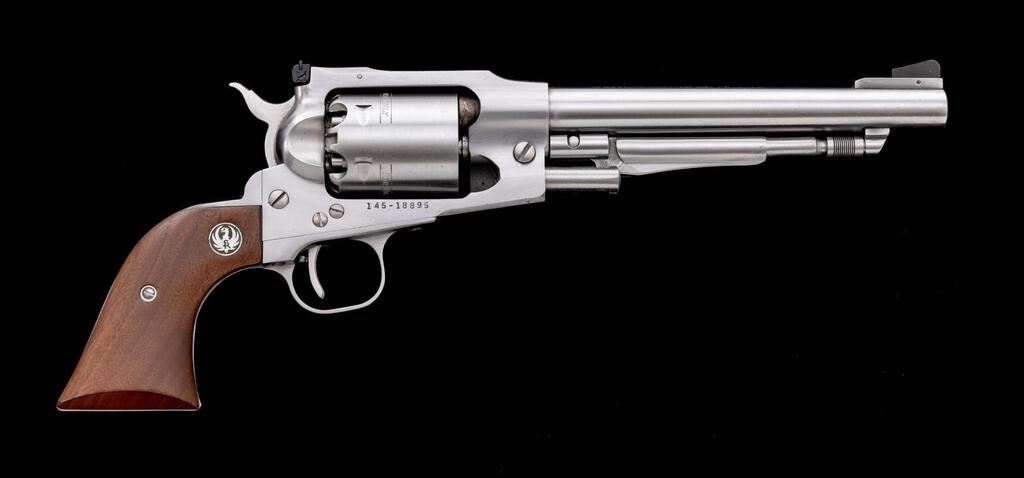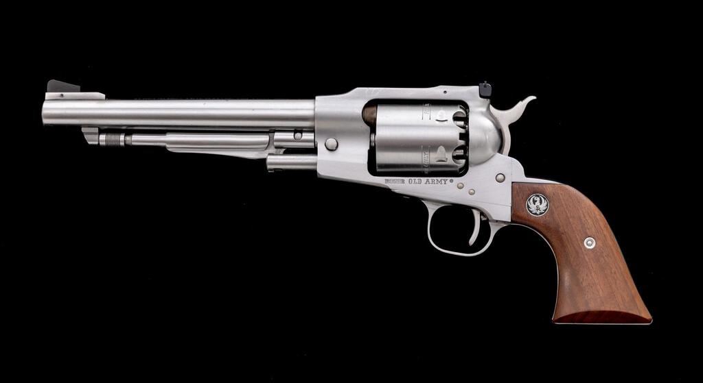 Ruger Old Army Single Action Percussion Black Powder Revolver, #145-18895, .45 cal., 7.5" barrel, ramped blade front and adjustable rear sights, stainless steel finish, smooth wood Ruger medallion two-piece grips, 6-rd. cylinder marked "Black Powder Only". Mfg'd 1982. Revolver is as new and appears to be unfired, with only light handling marks and scuffs. Smooth wood grips are excellent. Long out of production and desirable. Est.: $800-$1,000. (No FFL Required)