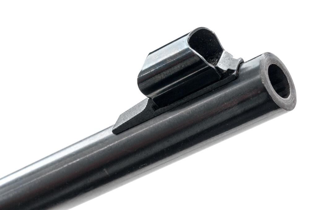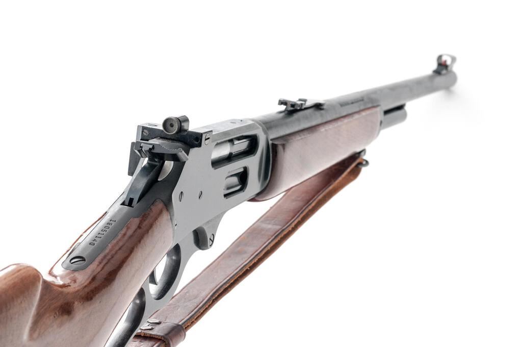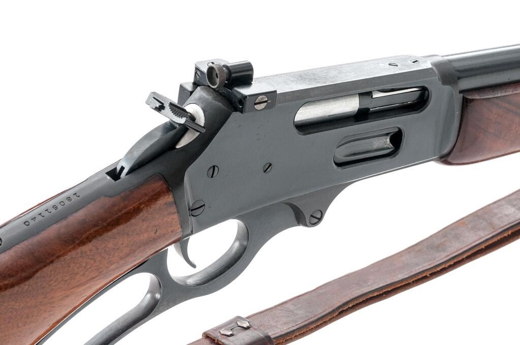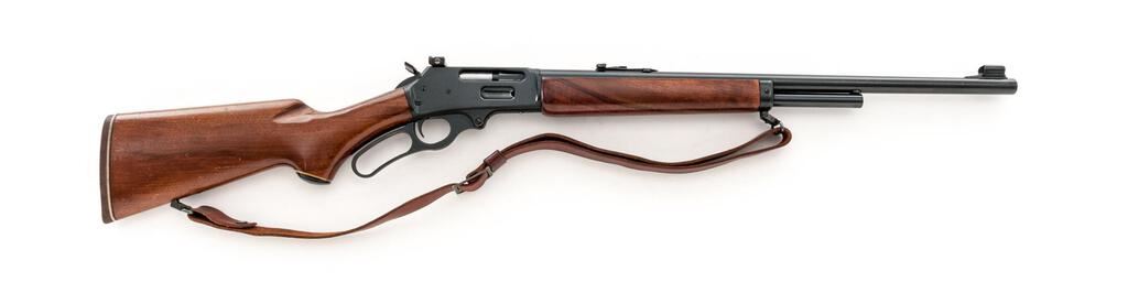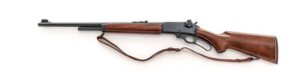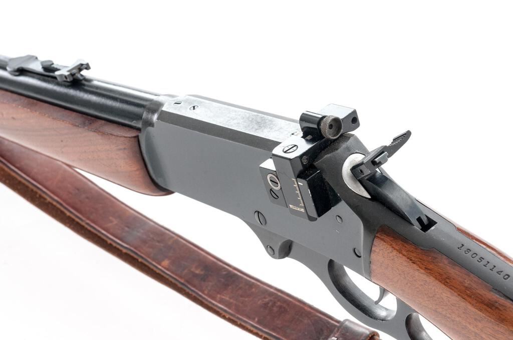 Marlin Model 444S Lever Action Rifle, #18051140, .444 Marlin cal., 22" barrel with micro-groove rifling, hooded blade front and folding buckhorn rear sights, half magazine, hammer extension, blue finish, smooth wood two-piece pistol grip stock, Williams aperture sight, sling swivels, and a period leather rifle sling. Mfg'd 1982. Rifle is in near fine overall condition retaining approx. 95% factory blue finish, with light scratches, handling marks and edgewear. Smooth wood stock is in good condition with mars and compressions consistent with field use. Stock ends with a Marlin marked solid rubber recoil pad providing a 13.75" LOP. Front sight has been colored red with fingernail polish, and a Williams peep sight has been added during the period of use. Missing inletted bullseye into rear bottom of stock. Action works well, bore is very good with sharp micro-groove rifling. Est.: $800-$1,000. (Modern)