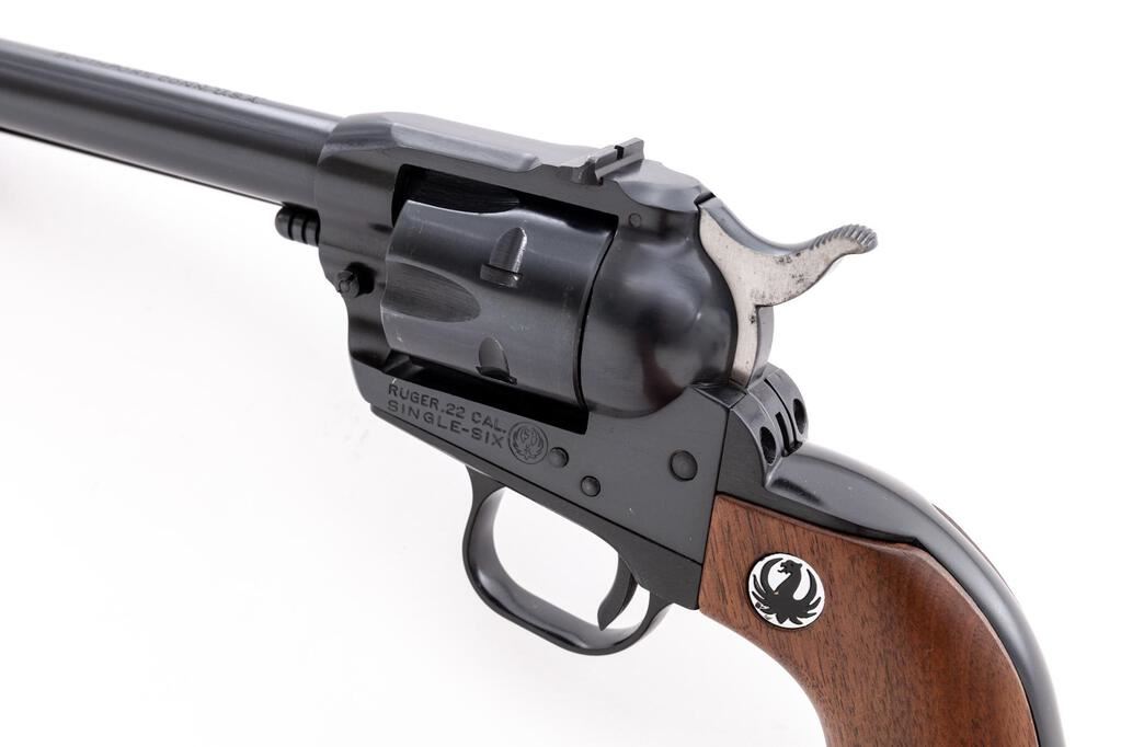 Ruger Single-Six Convertible Single Action Revolver, #484537, .22 WMR cal., 6.5" barrel, blade front and square-notched drift adjustable rear sights, blue finish, smooth walnut Ruger two-piece medallion grips, with extra .22 LR cylinder. In factory cardboard box with matching end label, warranty card, and manual. Mfg'd 1967. Revolver is in near excellent overall condition showing little use, retaining approx. 97%-98% factory blue finish, with light wear at the muzzle and a faint index line on the cylinder. Smooth walnut medallion grips are about excellent. Bore is very good and action is crisp on this desirable pre-transfer bar gun with a three-screw frame and extra cylinder. Est.: $400-$600. (C&R/PPT)