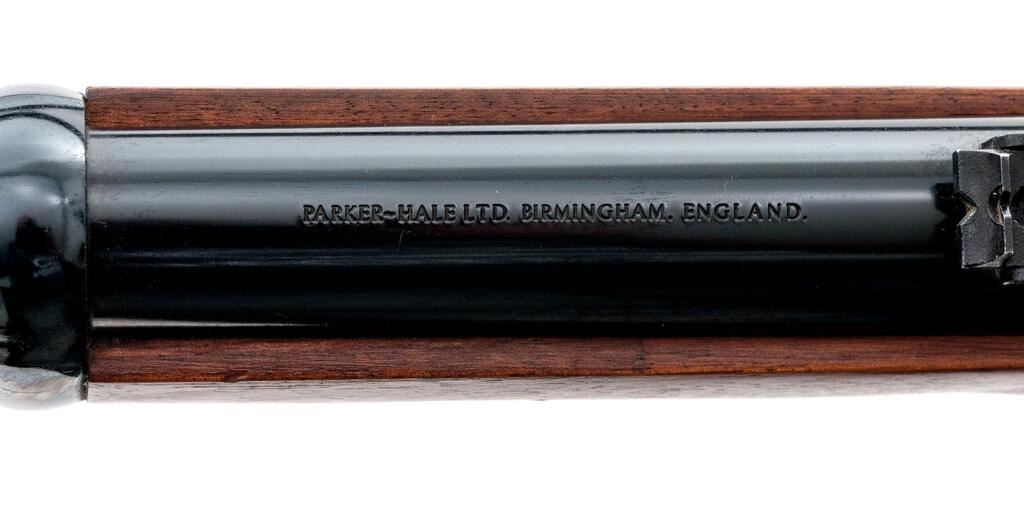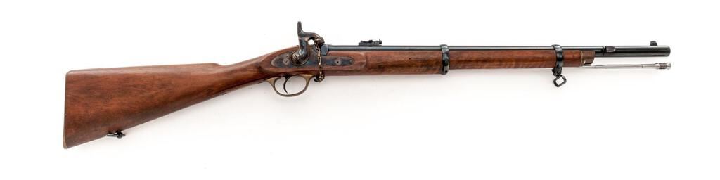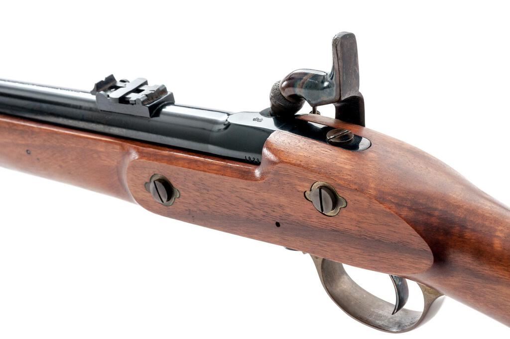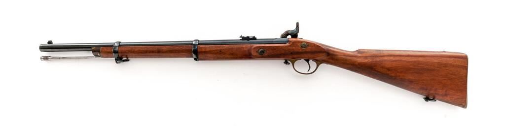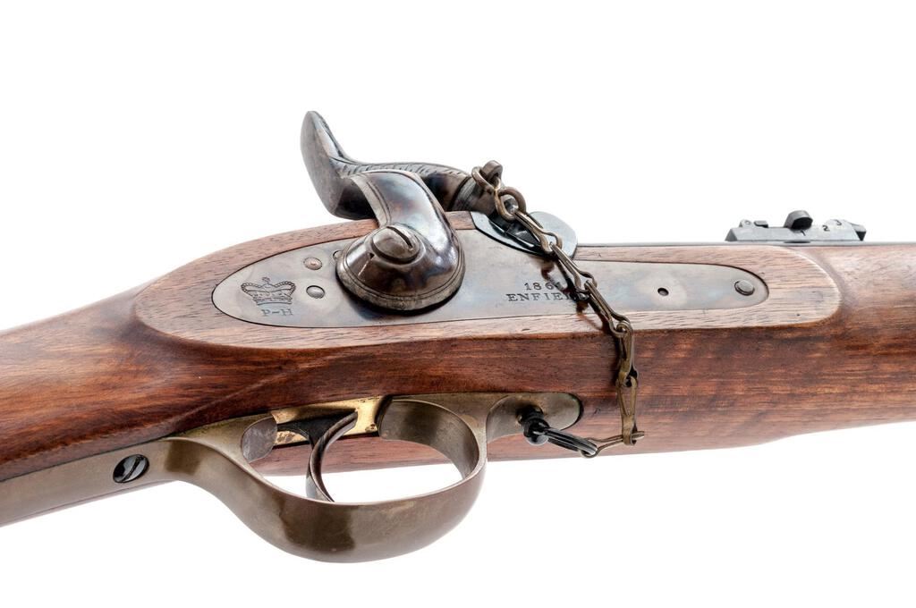 Reproduction British Tower Enfield P-1861 Percussion Musketoon, by Parker-Hale, Birmingham, #1929, .58 cal., 24" round barrel with carbine sights and bayonet lug 4" below muzzle, marked with maker's name and address at top and "(crown)/BP" at breech; flat lockplate marked "1861/Enfield" ahead of engraved military hammer and "(crown)/P-H" behind; brass trigger guard with chain-retained nipple protector, buttplate, 2 "winged" lock bolt escutcheons, nosecap; 2 steel clamping bands (front with sling swivel) retain the slotted/grooved ramrod. Oil-finished walnut 3/4" stock has a .75" roundel at right marked "Parker-Hale/Ltd.", sling swivel at belly. Condition is near new retaining approx. 98% deep black-blue to barrel and bands, vivid case colors to lock/hammer (light rubbing where chain rests), toned brass. Stock with smooth finish is unmarked. Action is crisp, unfired bore shows full blue, light rifling. Est.: $450-$650. (No FFL Required)