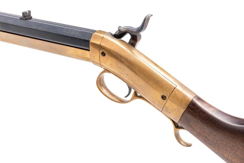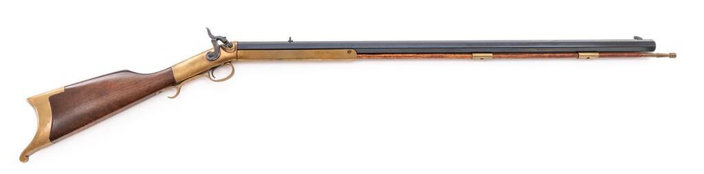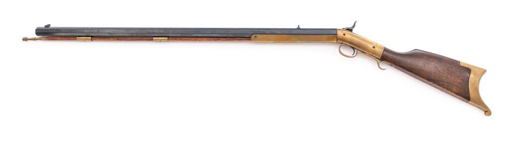 Reproduction Brass Frame Percussion Sporting Rifle in the Allen & Thurber Style, #6351, .45 cal., heavy 32" octagonal barrel (measures 1" across flats) with blade front/notched rear sights, marked "45" and "Mowrey/Olney, Texas" at right breech; brass frame has integral nipple bolster with cleanout screw, heavy Swiss-style buttplate, 9" brass forend, 2 pipes retaining the brass-tipped hickory ramrod. Mfg'd ca. 1970s. Condition is near excellent retaining approx. 98% blue, showing light field use and smooth toned brass. Stock with 2" encircled 8-pointed star at left. Action is crisp, bore is bright with sharp rifling. Est.: $300-$500. (No FFL Required)