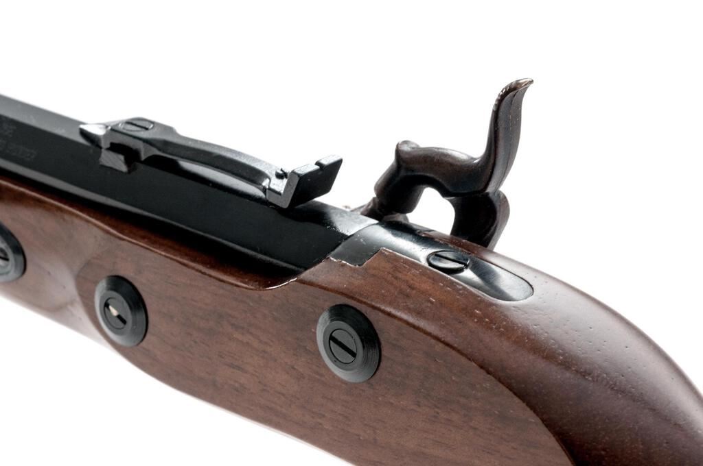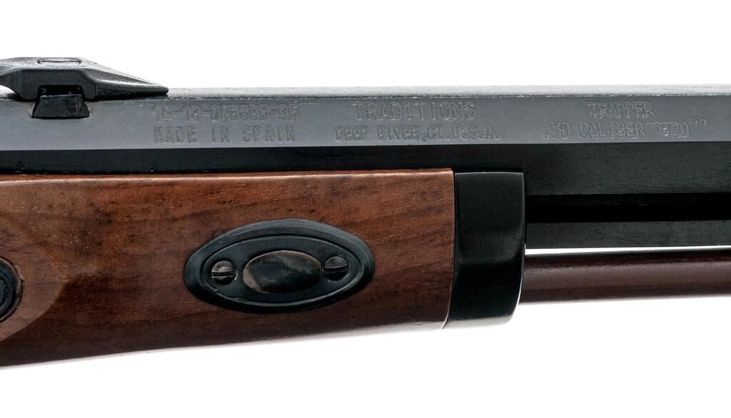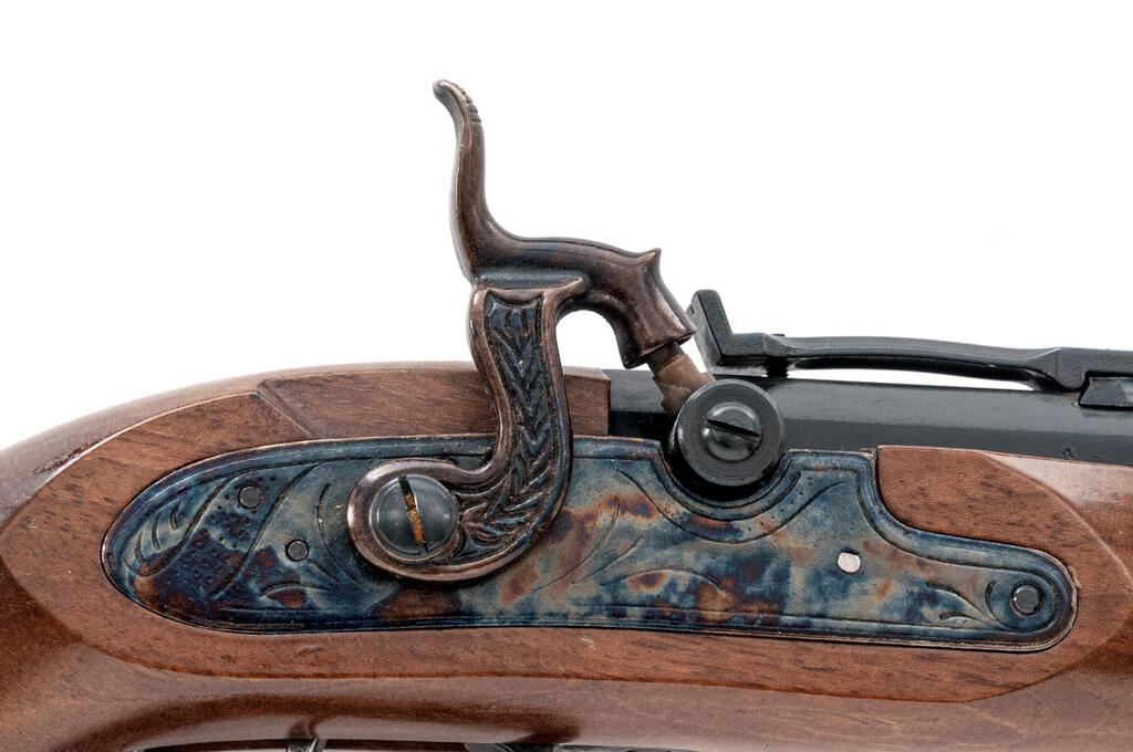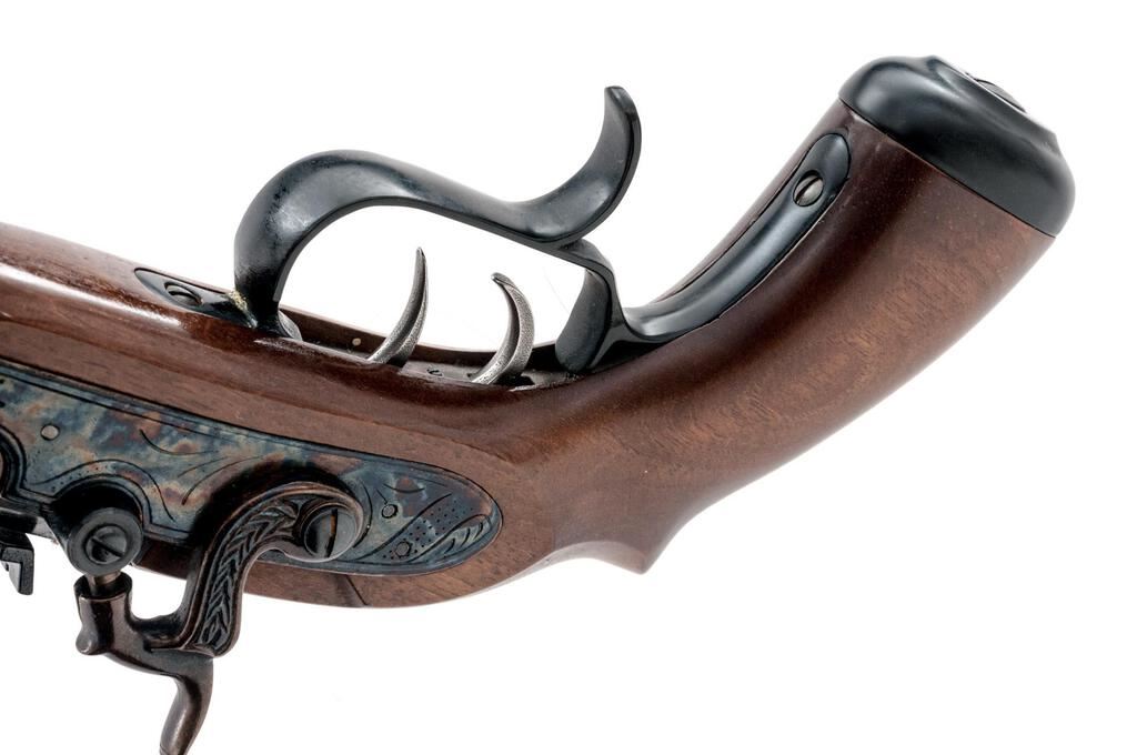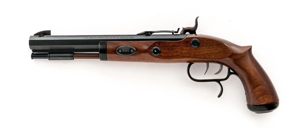Reproduction Saw-Handle "Trapper" Percussion Target Pistol, by Traditions, #14-13-048685-95, .50 cal., 10" heavy octagonal barrel marked with maker's info, etc., at left, B.P warning at right, has tall blade front and adjustable notched rear sights, under-rib with single ferrule retaining the ramrod; engraved flat lockplate with matching hammer has drum nipple bolster. Smooth walnut halfstock has scrolled trigger guard, double set triggers, oval buttcap, flat nosecap. Condition is new and unfired retaining 100% original finishes, sharp edges and markings. Stock is sound and smooth with lovely satin finish. Action is crisp, triggers work as designed, bore shows full blue and sharp rifling. Fitted Styrofoam box insert in good condition is included. Est.: $200-$300. (No FFL Required)
