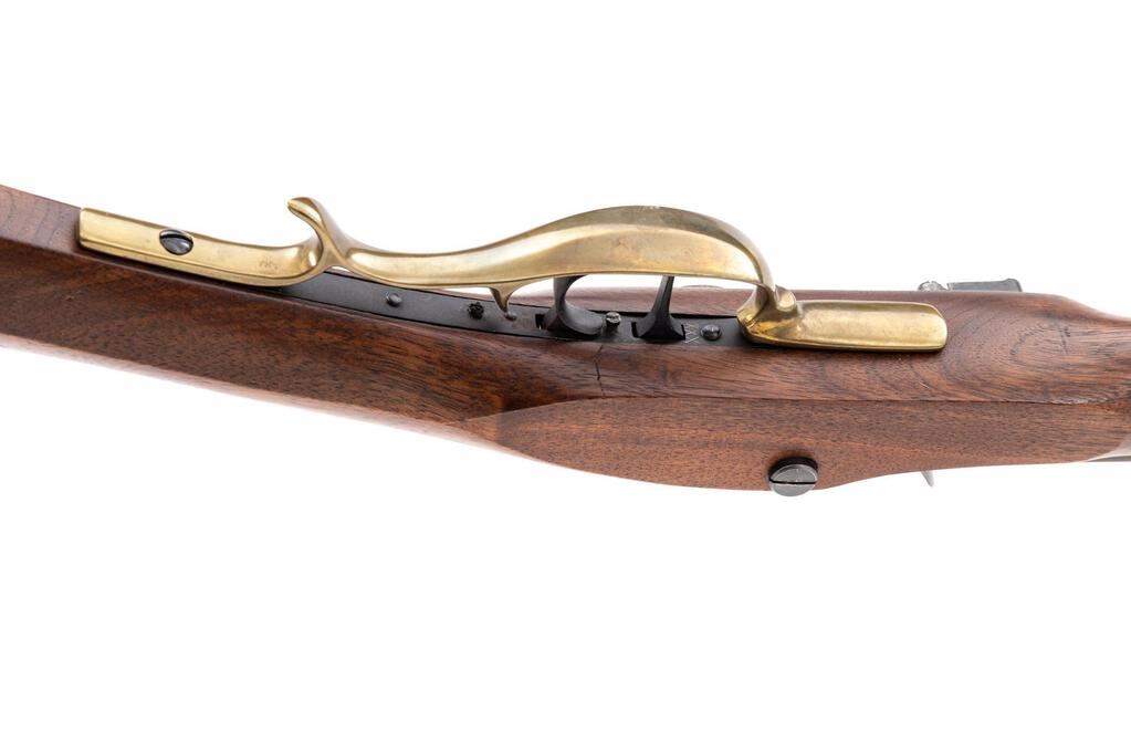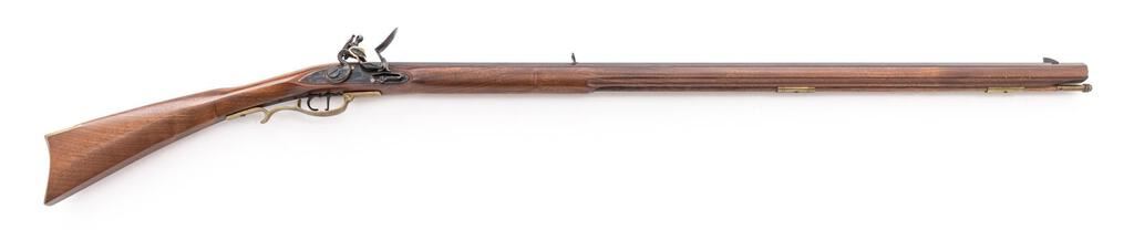Reproduction Early American Flintlock Longrifle, by Pedersoli, #82013, .50 cal., browned 39" octagonal barrel has tall buckhorn style sights, marked with maker's info, etc., at left; case hardened flat lock has matching swan-neck cock, integral pan with fence, removable touchhole liner; brass furniture includes long scrolled trigger guard, crescent buttplate with faceted tang, 2 ferrules retaining the brass-tipped hardwood ramrod. Satin-varnished walnut fullstock has slender wrist having a diamond cross-section, raised cheek rest, carved flutes between midpoint and muzzle. Double set triggers. Condition is new and unfired retaining 100% barrel brown, vivid case colors, bright brass, unmarked stock with pleasing grain, color, and finish. Action is crisp, triggers work as designed, bore is brilliant with sharp rifling. Est.: $600-$800. (No FFL Required)