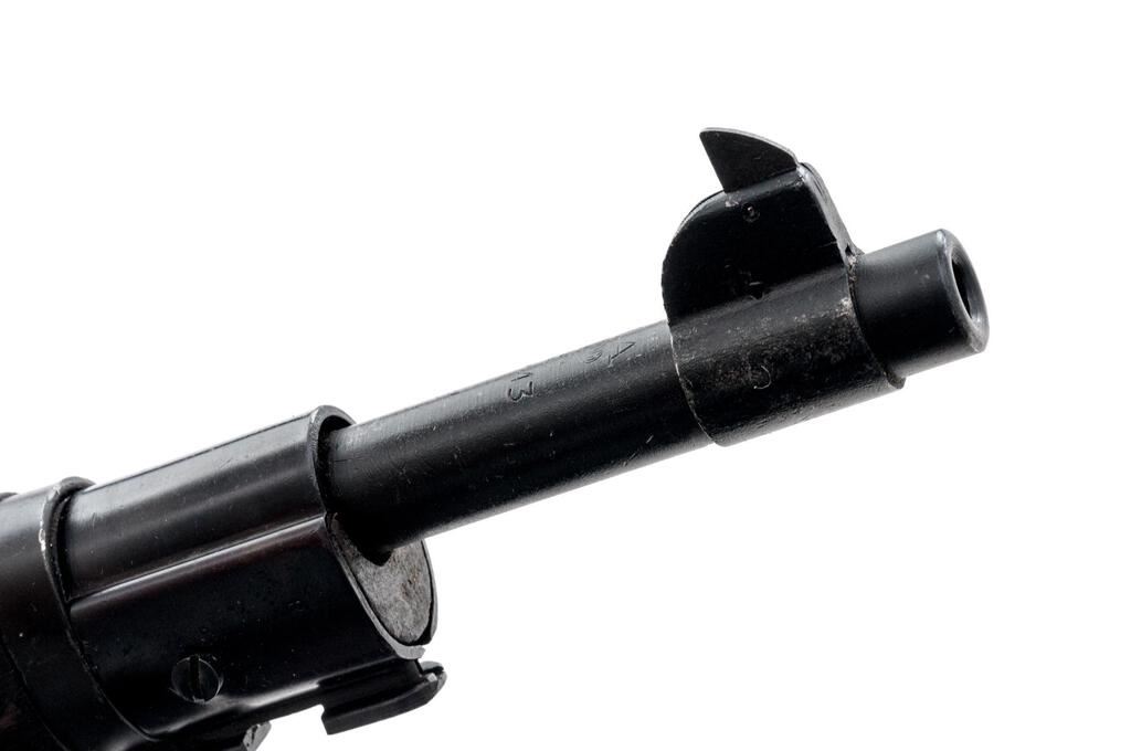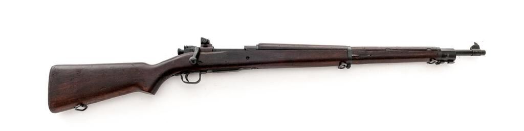 Remington Model 1903-A3 Bolt Action Rifle, #4084776, .30-06 cal., 24" barrel, blackened finish, walnut stock set, blade front sight and adjustable sliding aperture rear sight. Marked "U.S. REMINGTON MODEL 03-A3" on top of receiver ring. Barrel behind the front sight is marked "RA/(flaming bomb)9-43". The Scant stock is stamped "AA HO" on the left-side wrist, with a boxed "RIA/EB" on the left-side buttstock. There are two "P" firing proofs stamped into the underside of the wrist. Two mismatched numbers have been engraved into the top of the bolt handle and stamped into the right-side buttstock (partially removed). Rack #394 stamped into comb of buttstock. Condition overall is very good with the metal retaining approx. 90% finish. There are 4 spliced inserts to repair cracks to the top of the hand guard, otherwise the wood is very good showing old scratches and handling marks to the dark finish. Action operates smoothly, bright bore is excellent with excellent two-groove rifling. No visible import marks. Est.: $700-$900. (C&R)