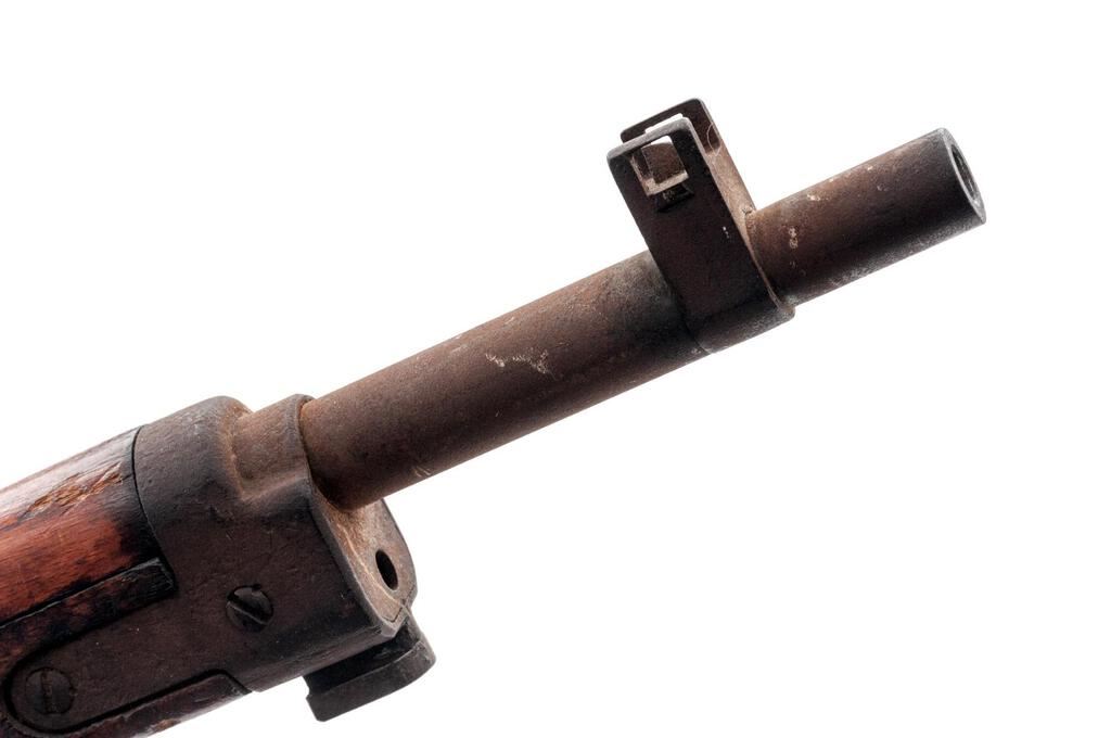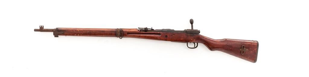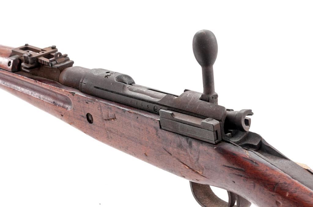 Battle Damaged Japanese Type 99 Arisaka Bolt Action Rifle, #2145, 7.7x58mm, 25.5" barrel, blued finish, two-piece hardwood stock, inverted "V" front sight with protectors and adjustable folding leaf rear sight with aperture. Marked on top of receiver ring with ground-off mum crest over characters for "99 Type". Left-side receiver rail stamped with Fourth Series mark and the two symbols for the Izawa Jyuko Arsenal. Matching number on bayonet lug. #415 stamped on underside of bolt handle. Rifle appears to have been shot with a bullet removing the cocking piece and bending the bolt body with the bolt now jammed inside the receiver. Additional bullets struck the right side of the stock wrist removing approx. a 3"x2" section of wood. Condition overall is poor with most of the metal frosted with a rust patina. Stock is cracked forward of the damaged area and shows other handling marks and darkening to the finish. Muzzle inspection shows a good bore with good shallow rifling. Action cannot be operated. Est.: $300-$500. (C&R)