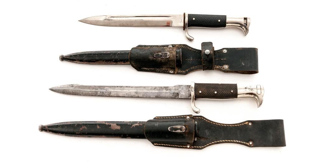 Lot of Two (2) German Dress Bayonets, with Frogs: (1) WW1 era dress bayonet, 10" blade was originally a saw back but has had the saw teeth removed, early Eickhorn double squirrel maker's mark at ricasso, checkered horn riveted grips, nickel-plated cross guard and eagle head pommel with pushbutton. In black painted steel scabbard, with WWII k98 bayonet leather frog showing faint maker's mark and dated 1942. Blade shows age graying and light rust stains, flaking to the nickel plating on the guard and pommel, wear and minor chips to the grips. Scabbard shows scuffs, scratches, and losses to the painted finish; frog shows age, scratches, and light wear. (2) Early Nazi era dress bayonet with 8" nickel-plated blade, early oval Eickhorn squirrel logo, original leather blade washer, nickel-plated cross guard and eagle head pommel, missing the pushbutton retainer; checkered hard rubber riveted grips, black painted steel scabbard, leather WWII k98 bayonet leather frog with retaining strap, no markings. Blade is mostly bright with minor freckling, light wear, and runner marks. Cross guard and pommel show light scratches and minor bubbling to the nickel plating. Grips are very nice. Scabbard shows scratches and losses to the paint; frog shows soiling and wear, with some cracking to the leather and strap. Est.: $200-$400/Lot.