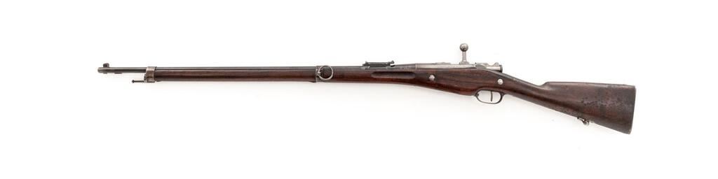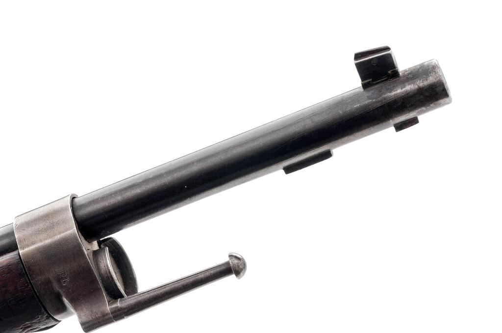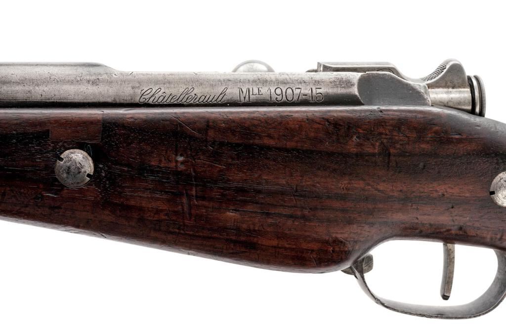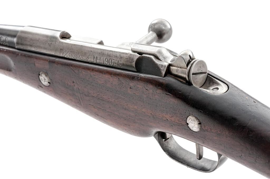 French Model 1907-15 Berthier Bolt Action Rifle, #59035, 8x50Rmm, 31.6" barrel, blued finish, hard wood stock set, blade front sight and adjustable folding leaf rear sight. Marked on left-side receiver "Chatellerault MLE 1907-15". Right-side barrel marked "MA C 1916". There is a faint roundel stamped into the right-side buttstock. Matching numbers. Condition overall is very good with the metal retaining approx. 70% finish, showing a spliced repair to the left-side forend. Wood has dark chemical type stains on both sides of the buttstock, otherwise the wood is good with cuts, scratches, and handling marks to the finish. Action operates smoothly, bright bore is excellent with well-defined rifling. No visible import marks. Est.: $600-$800. (C&R)