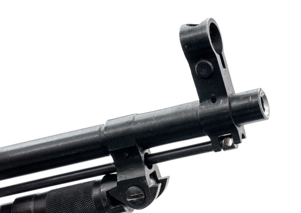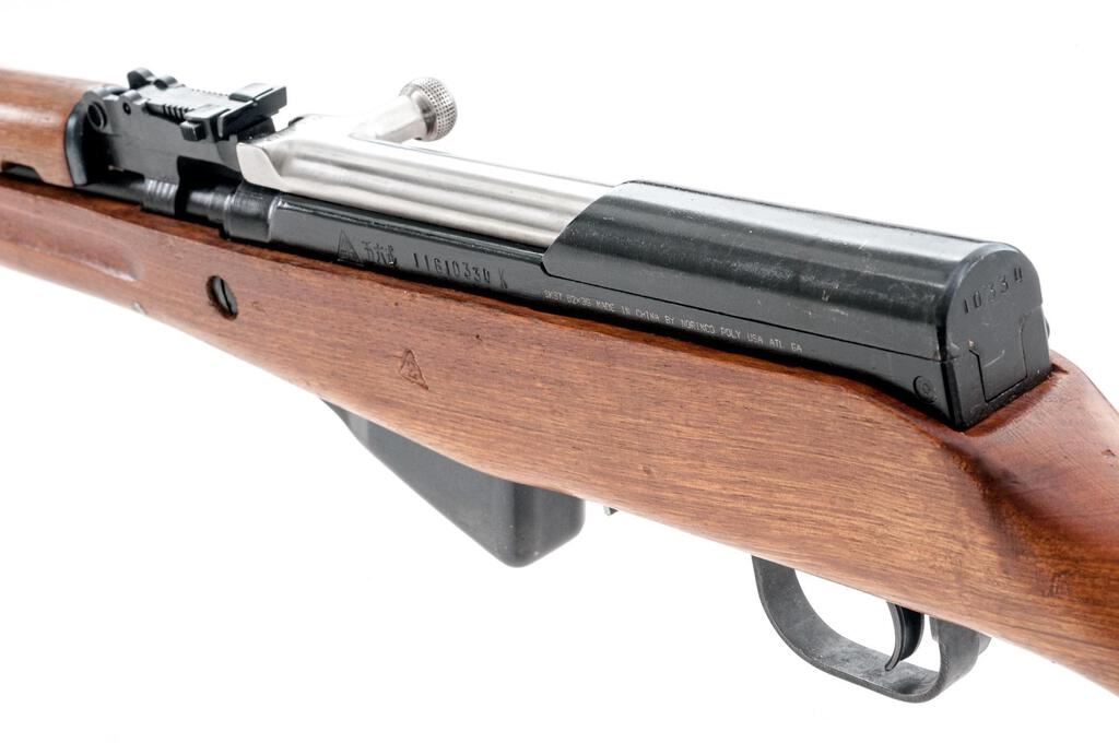 Chinese SKS Semi-Automatic Carbine, with Folding Bayonet, #11610334, 7.62x39mm, 20.5" barrel, blued finish with bright bolt and carrier, hardwood stock set, hooded post front sight and adjustable leaf rear sight. Cleaning rod mounted under barrel with cleaning kit behind buttstock trapdoor. Marked on left-side receiver with "Triangle 26" arsenal stamp next to three characters for "Type 56 carbine". "Triangle 2" stamp on left-side forend. Matching visible numbers. Condition overall is near excellent with approx. 95% of the salt blue finish remaining on the metal. Wood shows scattered mostly light handling marks to the even colored finish, otherwise close to excellent. Action and bayonet operate smoothly, bright bore is excellent with sharp well-defined rifling. Import engraved on left-side receiver "SKS 7.62x39 MADE IN CHINA BY NORINCO POLY USA ATL GA". Est.: $500-$750. (C&R/PPT)