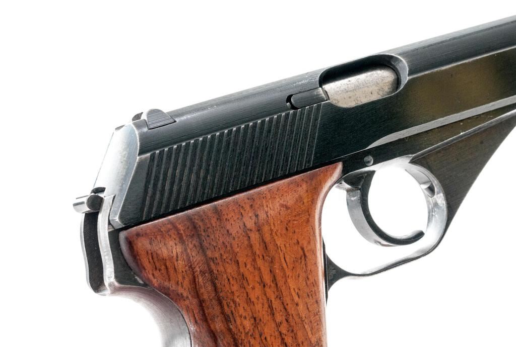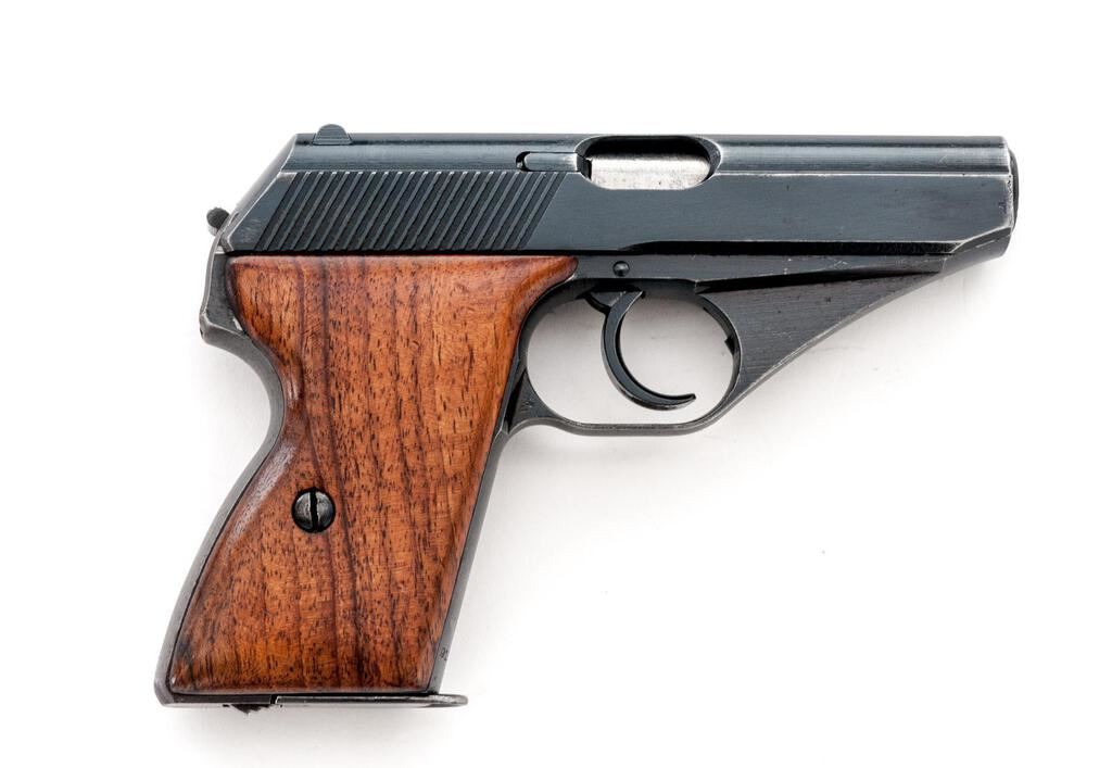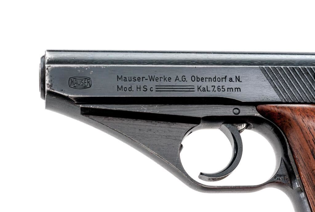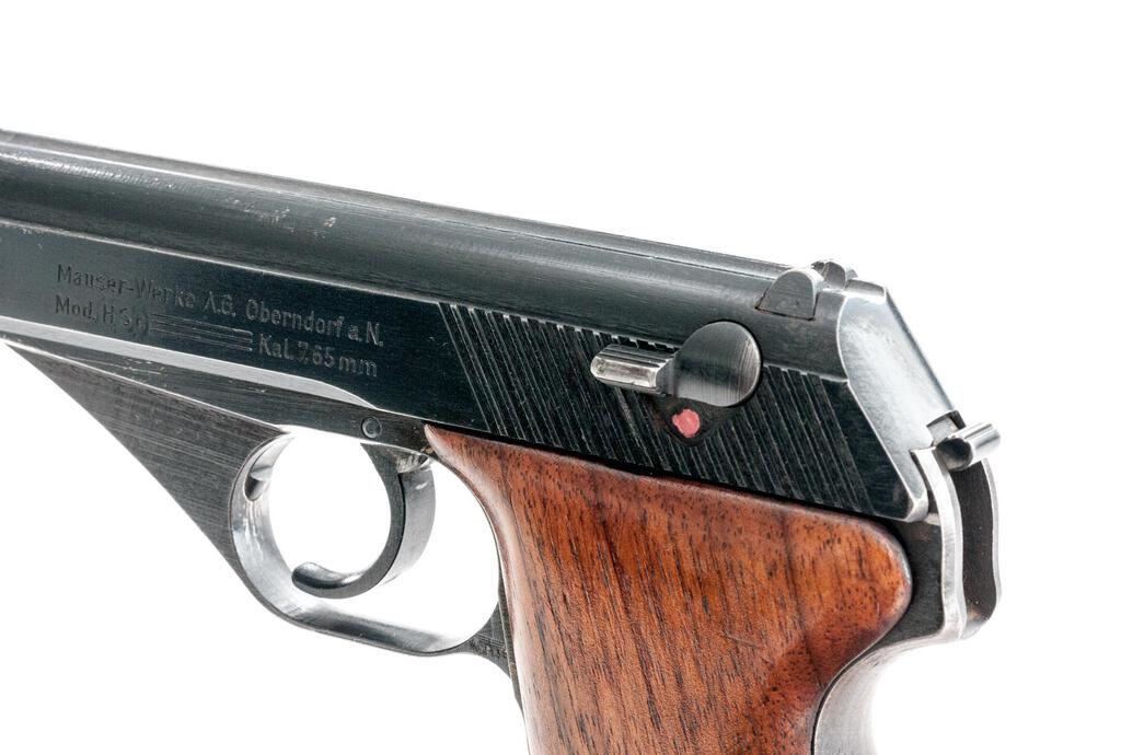 German Military Mauser HSC Semi-Automatic Pistol, with Extra Magazine, #912078, 7.65mm, 3.25" barrel, blued finish, smooth walnut grip panels, inverted "V" front sight and drift adjustable rear sight with "U" notch. Both magazines have base plates marked "MAUSER" with half-moon indented front tabs instead of the unmarked flat base types originally made for this late WWII variation. One shows some patina, otherwise both are in very good condition. Pistol is marked on left-side slide with "MAUSER" logo and "MAUSER-WERKE A.G. Oberndorf a.N./Mod. HSc/three lines/Kal.7,65 mm"; Army "Eagle/WaA 135" stamp on left side trigger guard; "(eagle)N" stamp on right-side slide and trigger guard. Grips are smooth uncheckered replacements. Condition overall is very good with the metal retaining approx. 90% finish, which shows holster patina around the slide at the muzzle and dark patina along the rear grip strap. Grips have had added varnish applied, now very good, showing light handling marks. Action operates smoothly, bright bore is good with worn rifling. No visible import marks. Est.: $500-$700. (C&R/PPT)