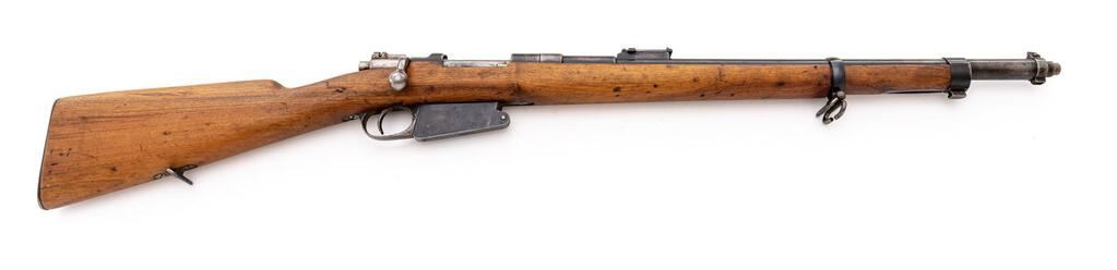 Shortened Belgian Model 1889 Mauser Bolt Action Rifle, #B9665, 7.65x53mm, 22" barrel, blued finish, hardwood stock set, inverted "V" front sight and adjustable folding leaf rear sight. Marked "ETAT BELGE BIRMINGHAM" on top of receiver ring. Matching numbers except for stock. Rifle appears to have been arsenal shortened to its present configuration. Condition overall is good with the metal retaining approx. 60% finish, showing thinning and patina and with a dent to the top of the barrel jacket. Wood has been sanded and oiled over old handling marks, now in good condition. Action operates smoothly; bore has a dark area mid barrel that may clean better, otherwise bright with very good rifling. No visible import marks. Est.: $300-$500. (C&R)