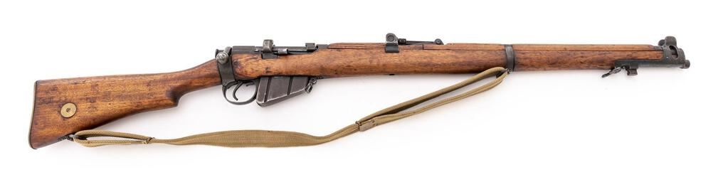Australian No. 1 Mk III* Lee-Enfield Bolt Action Rifle, #48018, .303 Brit. cal., 25.2" barrel, phosphate/blued finish, hardwood stock set, blade front sight with protectors and adjustable tangent rear sight. Marked on right-side action body with 7-pointed star over shield containing "LITHGOW/SHT.LE/III*/1916", and "MA 57" on the left side. Matching numbers on bolt handle, other numbers mismatched. An early Number 3 magazine and cutoff is fitted and a reproduction brass disc is screwed to the buttstock. A very good condition British WWII cotton sling is attached. Condition overall is very good, the metal retaining approx. 85% of its partial refinish, with the magazine toning to a brown color. There is a chip missing from the left-side forend, and the wood has been sanded and oiled over old handling marks, otherwise good. Action operates smoothly, bright bore is excellent with sharp well-defined rifling. Import stamped on right side of receiver. Est.: $400-$700. (C&R)
