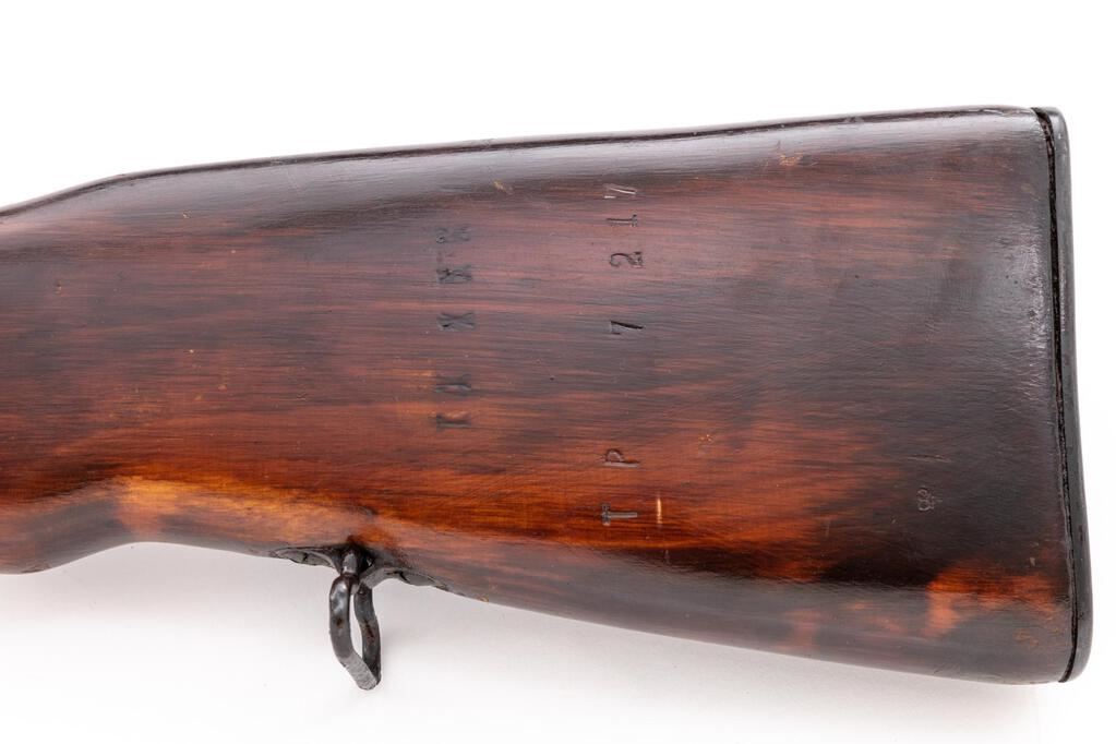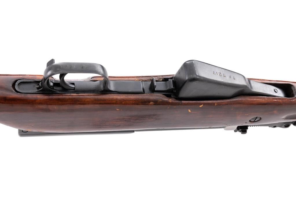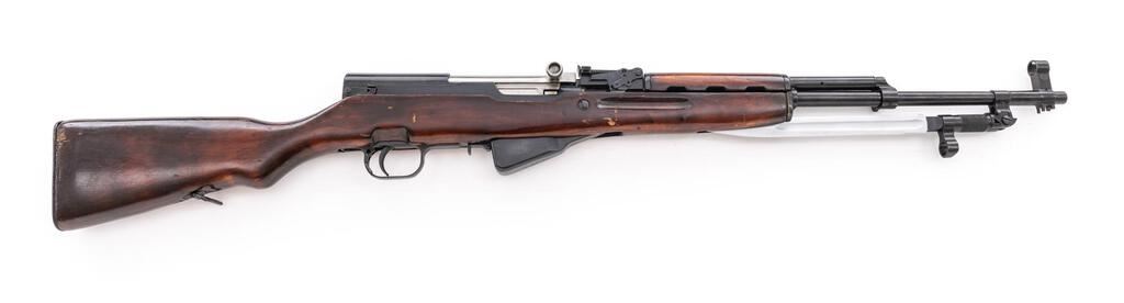 Soviet SKS Semi-Automatic Carbine, with Folding Bayonet, #TP7217, 7.62x39mm, 20.25" barrel, blued finish, hardwood stock set, hooded post front sight and adjustable tangent rear sight. Carbine has been arsenal reconditioned, the mfgr's mark has been removed from the top of the receiver cover and a refurbishment mark stamped in its place with the area refinished. Left-side receiver is marked with a five-pointed star. Visible numbers match, with the right-side buttstock re-numbered from a previous serial number. Rifle is missing its cleaning rod and buttstock cleaning kit. Condition overall is very good with the metal retaining approx. 95% finish showing some scratches to the buttplate. Wood is very good showing recent scattered handling marks to the dark shellac finish. Action operates smoothly, bright bore is very good with very good well-defined rifling. Import stamped on right side of barrel. Bayonet is in excellent condition and also operates smoothly. Est.: $700-$900. (C&R/PPT)