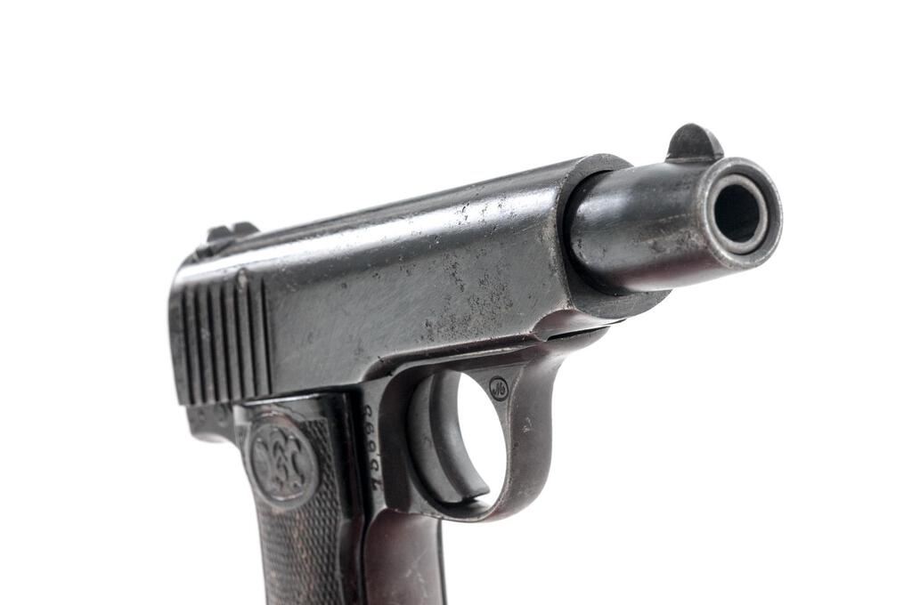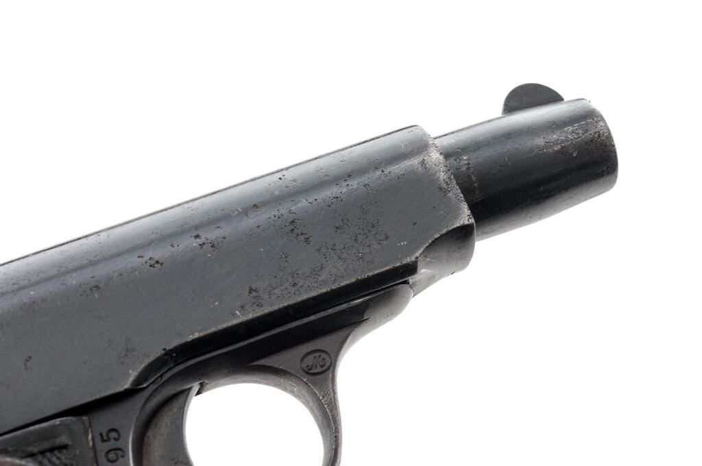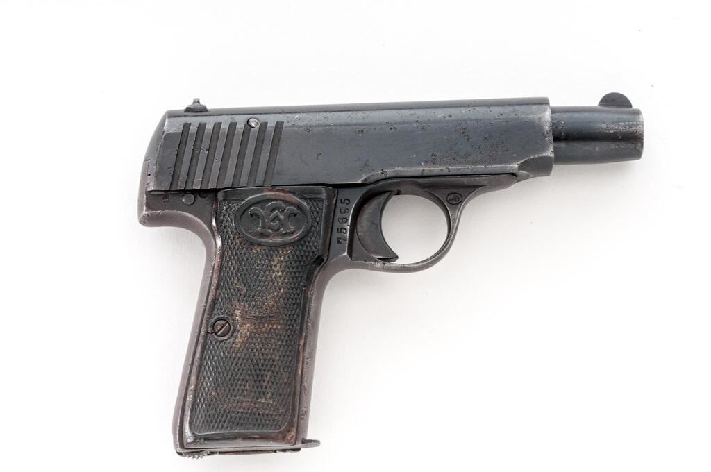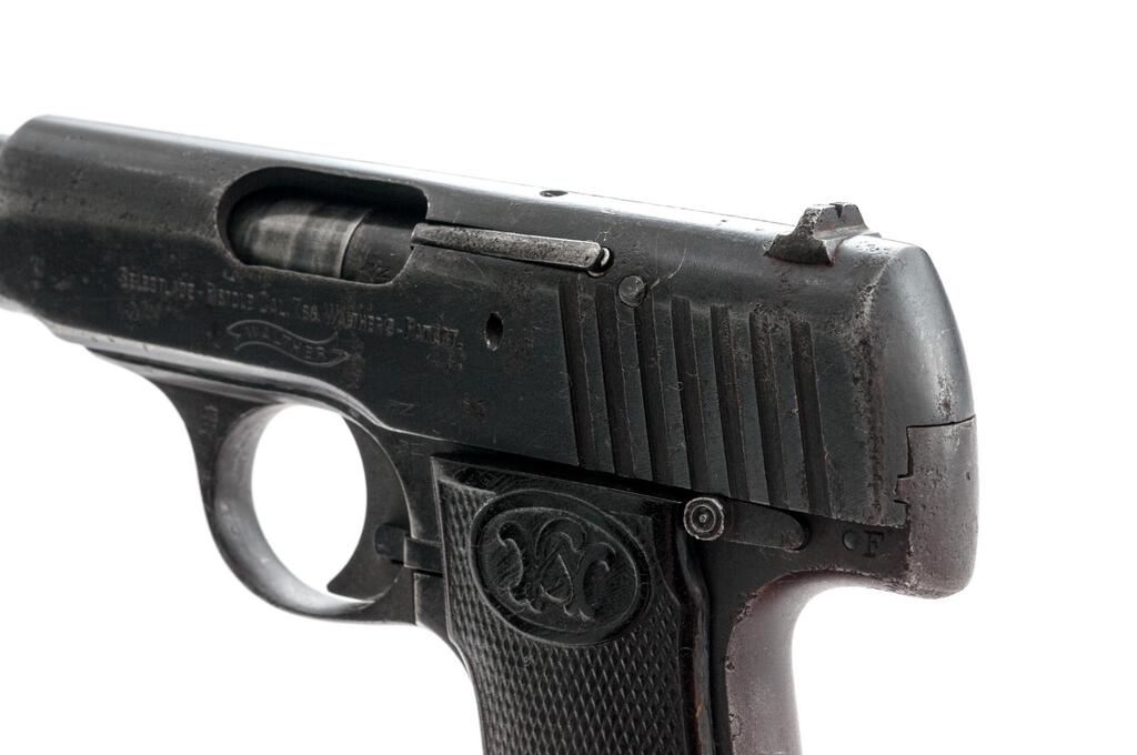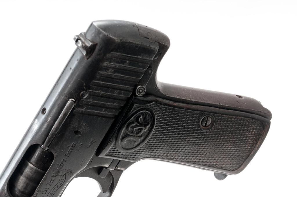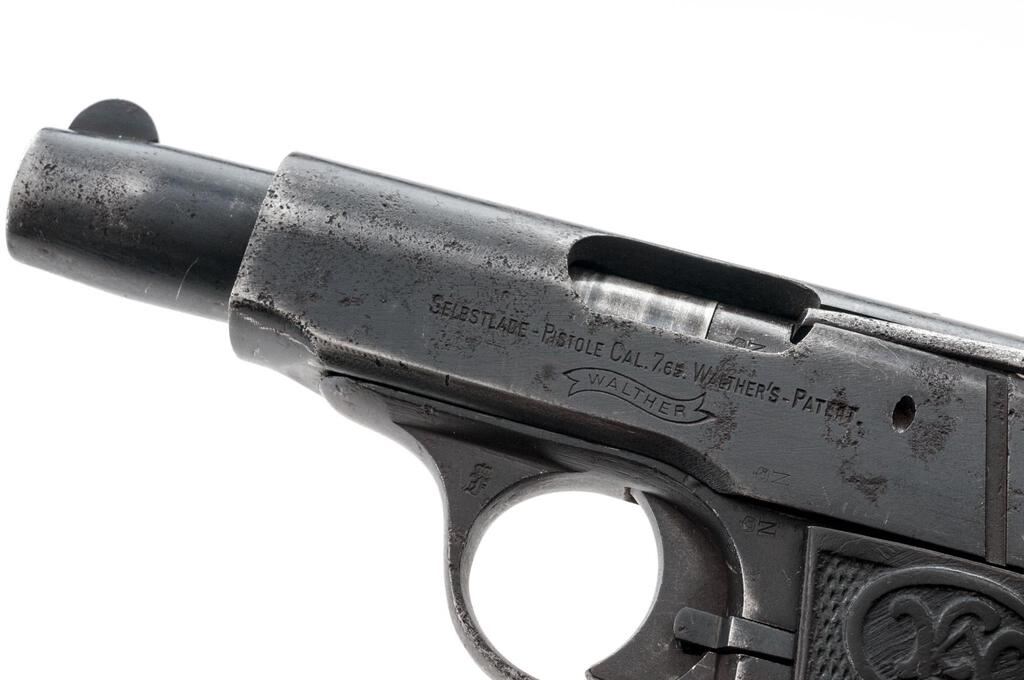 Walther Model 4 Semi-Automatic Pistol, #75695, 7.65mm, 3.5" barrel, blued finish, hardwood grips with Walther "WC" logo on each side, blade front sight and drift adjustable rear sight with "V" notch. Marked on left side slide "SELBSTLADE PISTOLE CAL. 7.65 WALTHER'S-PATENT" over a Walther Banner logo. Right-side slide markings have been removed. "(Circle)M" mark on right-side trigger guard. "(Crown)N" proof stamps on left-side frame and slide. Condition overall is fair showing pitting and patina scars under an old re-bluing. Grips are fair to good showing overall flattening to the checkering and a crack behind the right-side screw. Action operates smoothly, bore is dark with good rifling. Est.: $400-$600. (C&R/PPT)