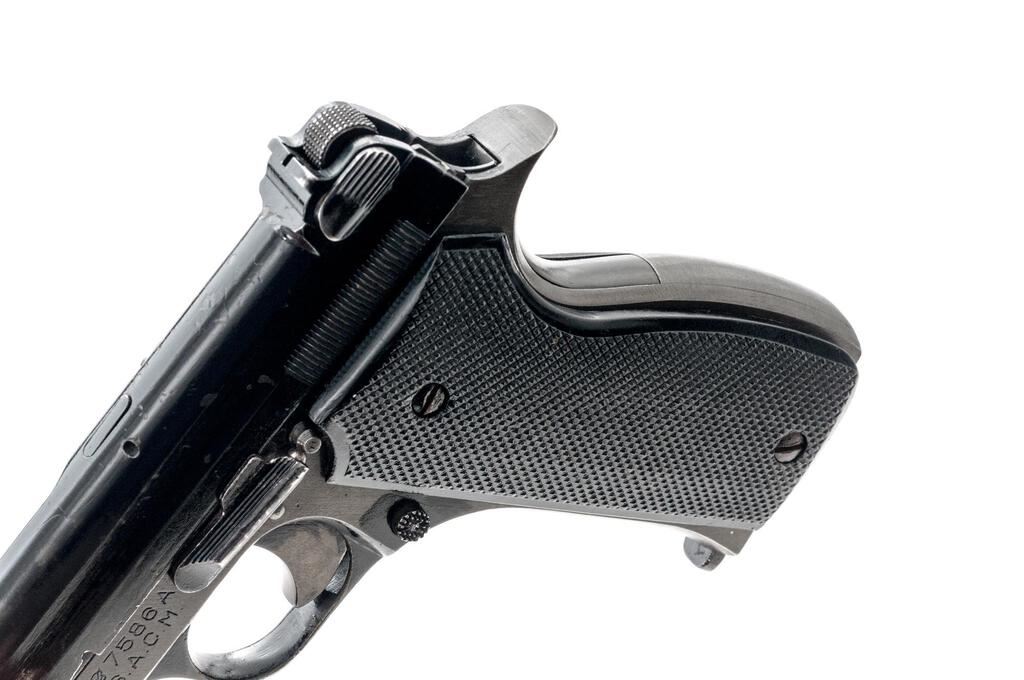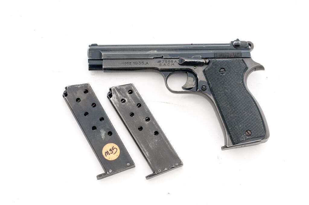 Nazi Marked French S.A.C.M. M1935A Semi-Automatic Pistol, #B7586A, 7.65x20 Longue cal., 4.37" barrel, black-painted finish, drift adjustable blade front sight and fixed rear sight with small square notch, safety lever blocks the firing pin, external hammer, single action, frame marked "Mle 1935-A, S.A.C.M.", serial number, Nazi "eagle WaA251" proof mark, checkered black hard rubber grips, and three (3) phosphate magazines with black-painted bottoms, marked 35_A. Condition is good, the slide retaining some of its black-painted finish with high edgewear at the front and edges of the sights, heavy wear to the paint on the left side of slide, with numerous small nicks and wear spots on top. Frame has had most of the paint removed or worn off and only traces remain in some protected areas. Body of the frame shows a dull phosphate type finish under the paint. Action, hold open, and safety function properly; bore shows frosting or fouling that may improve with a good cleaning, and strong lands and grooves. Grips show light soiling and minor scratches from use; grip screws are a little rusty with marred slots. Magazines show wear and lines from use, with minor scratches to the black-painted bottoms. Est.: $600-$800. (C&R/PPT)