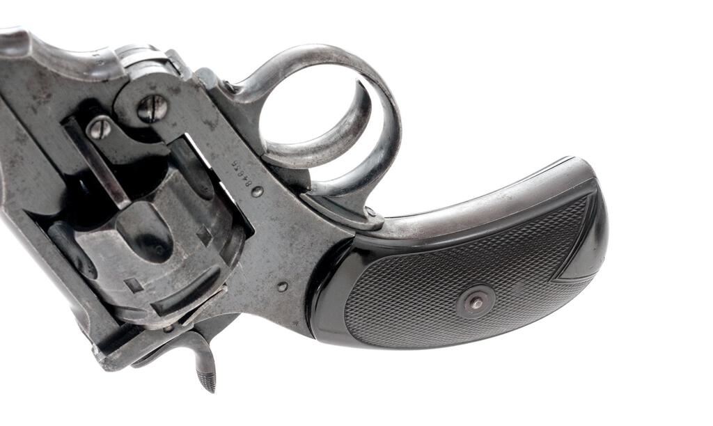 Commercial Webley Mark IV Double Action Revolver, #84635, .45 ACP cal., 4" barrel, blued finish, black plastic checkered grips, blade front sight and fixed rear sight with "U" notch. Marked on left-side frame with "WEBLEY PATENTS" and the trademark "Winged Bullet W&S". Left-side barrel strap marked "MARK IV", and the left-side barrel is marked ".455/.476". Top of barrel strap is retailer engraved "W.JEFFERY & SON./12 GEORGE ST. PLYMOUTH". Rear of grip strap has owner-applied initials "C.F.B." Barrel stamped with matching numbers, cylinder not numbered. Revolver has been importer converted to .45 ACP caliber by machining off the rear of the cylinder. Front sight has been modified by cutting off the rear portion. Lanyard opening has a steel plug fitted, probably by the factory. Condition overall is good with the metal retaining approx. 60% finish, with old pitting around the muzzle, scattered frosting across the frame and barrel, and brown patina to the front and rear grip straps. Grips are very good showing a few scuffs and handling marks to the checkering. Action locks, cycles, and ejects smoothly; bore has areas of pitting with fair to good rifling; chambers have dark areas that may clean better, otherwise good. No visible import marks. Est.: $600-$800. (C&R/PPT)