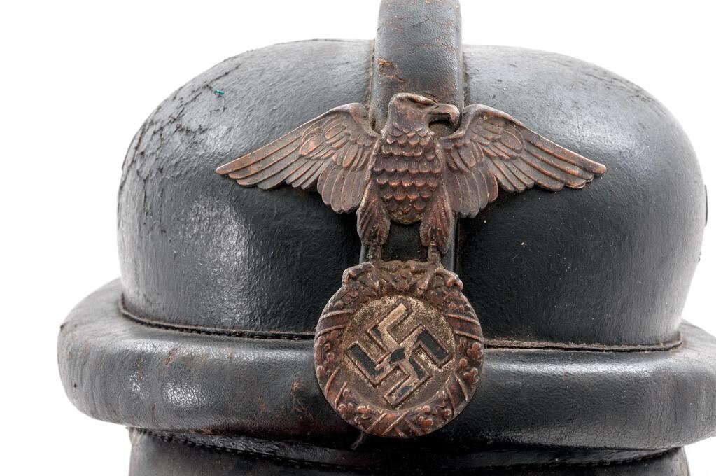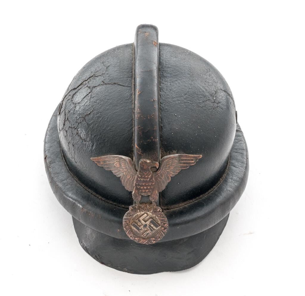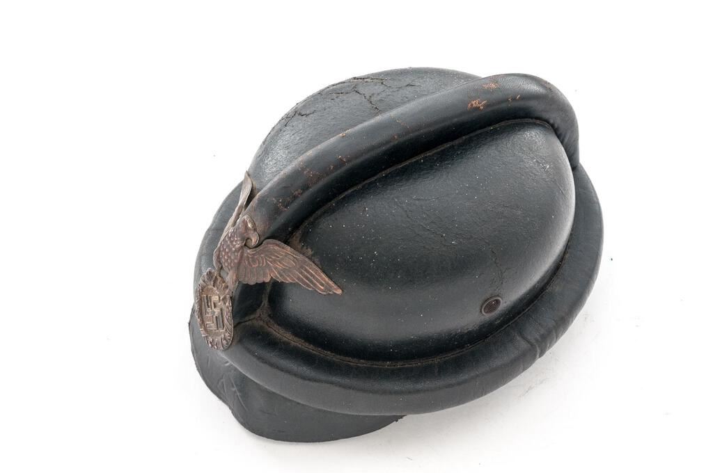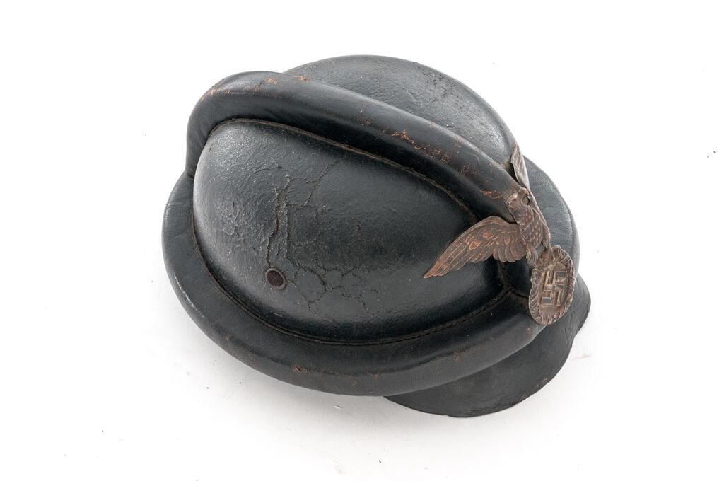 Early German NSKK Motorcycle Crash Helmet, for the NSKK motorcycle riders, with 1st pattern large Nazi eagle front plate, black leather body with padded outer rim and padded top ridge, wire mesh vent holes, thick leather neck guard, wide leather chinstrap to cover the ears with roller buckle, nine-tongue leather liner with broken tie string, thick patent leather visor. Condition is fair to good but showing age, the body showing some crazing, light cracking, and soiling; visor is stiff and shows shrinkage to the patent leather coating, the eagle has lost most of its silver wash and is fading to a dark copper color, with losses to the black paint in the swastika. Neck guard shows scuffs and cracking to the rear edge, chinstraps show age and minor cracking and scuffs, with some verdigris around the snaps. Liner shows much age, cracking, and scuffs. Faint maker's ink stamp on neck guard and marked size 57 on the liner. Est.: $300-$500.