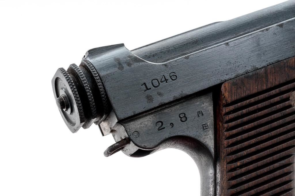 Early Japanese Type 14 Nambu Semi-Automatic Pistol, #1046, 8mm Nambu cal., 4.75" barrel, blued finish, straw finished trigger and safety lever, all visible numbers matching except magazine, Chigusa factory of the Nagoya Arsenal proof marks, dated Showa 2,8 (August 1927), small round trigger guard, drift adjustable inverted "V" front sight, integral fixed rear sight with square notch, early type knurled cocking knob, lanyard loop, 26-groove mahogany wood grips with no visible serial numbers, and one non-matching number nickel-plated magazine. Beginning in 1934 these early pistols were recalled to fit a magazine safety. This gun has that modification. Condition is very good as arsenal refinished, retaining approx. 90% blued finish, with minor pitting on the barrel, sides of slide and trigger guard, showing little to no holster wear to the finish, with minor wear lines on the rear of the slide from firing, and the typical half-moon scratches around the safety lever area. Front and rear grip straps show heavy freckling, trigger and safety lever show wear and losses to the straw finish with minor pitting, there is minor rust and staining on the bolt and around the lanyard loop. Action, hold open, and safety all function properly; bore is bright and shiny. Grips show age, soiling, scratches, and minor dings. Grip screws show wear and minor rust, with clean slots. Magazine shows light rust, stains, minor pitting, and wear from use, with some dings and rough areas on the base. Est.: $600-$800. (C&R/PPT)