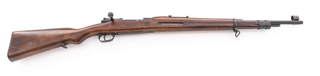 Composite German/Spanish Model 98 Mauser Bolt Action Rifle, #742, 8x57mm, 23.6" barrel, black paint/blued finish, hardwood stock set, inverted "V" front sight with attached hood and adjustable tangent rear sight. No cleaning rod. Rifle is built from a German WWI barreled action and a Spanish stock and hand guard. Receiver ring is marked on top "S/42/1937", and the left-side receiver rail is marked "Mod.98". Rear sight leaf is marked "S/42G". Mismatched numbers on replacement bolt assembly. Condition overall is good to very good as modified, with the receiver and barrel retaining most of its applied black-painted finish. Trigger guard shows old damage and a blued finish. The wrist is cracked and chipped behind the receiver tang, and the forend shows cracks forward of the trigger guard; hand guard is cracked behind the rear sight. Action operates smoothly, bright bore is good with worn rifling. No visible import marks. Est.: $600-$800. (C&R)