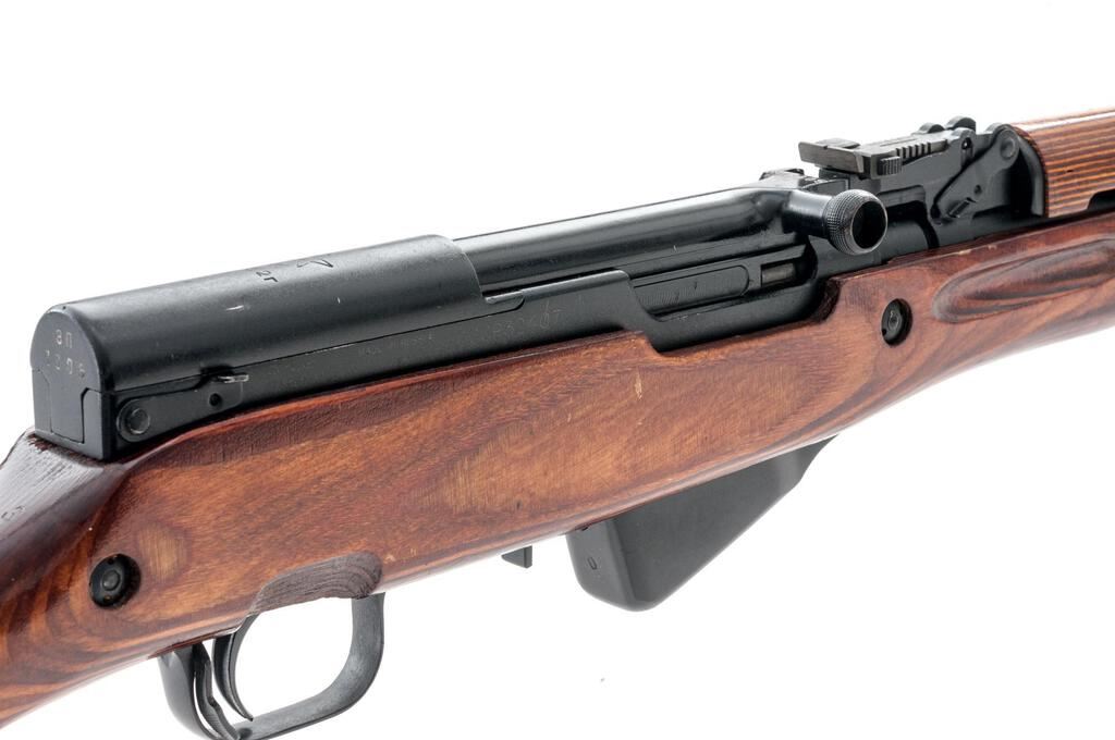 Soviet SKS Semi-Automatic Carbine, with Folding Bayonet, #CCCP32407, 7.62x39mm, 20.5" barrel, blackened finish, laminated stock set, hooded post front sight and adjustable tangent rear sight. Marked on top of receiver cover with the fletched arrow inside five-pointed star of the Tula Arsenal over "1952r". Also stamped with a later refurbishment stamp. Black bolt carrier. Visible original numbers match with magazine case renumbered to match. Cleaning rod is fitted under the barrel but the buttstock cleaning kit is missing. No sling is included. Condition overall is very good with the metal retaining approx. 95% finish, showing light wear to the edge of the bolt handle and bayonet collar. There are scratches to the left side of the forend as well as to the comb of the buttstock, otherwise the wood is very good, with scattered handling marks to the shellac finish. Action and bayonet operate smoothly, bright bore is excellent with well-defined rifling. Import engraved and re-serial numbered by importer on right side of receiver. Est.: $700-$900. (C&R/PPT)