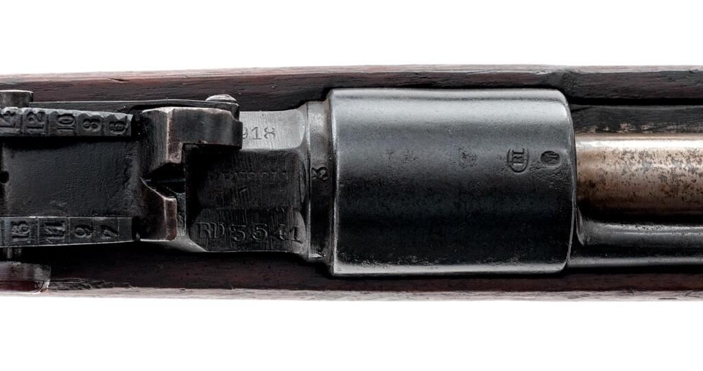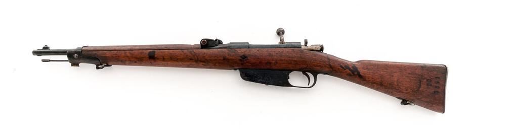 Italian Model 1891 Carcano Bolt Action Musketoon, #BD3541, 17.7" barrel, blued finish, hardwood stock set, inverted "V" front sight and adjustable leaf rear sight with "V" notch. Cleaning rod mounted under barrel. Top of receiver ring marked "RI". Top of barrel shank marked with faint "BRECIA". Right side marked "1918". Matching serial number on left-side buttstock behind faint cartouche stamp; right-side buttstock stamped "PM" in circle. Condition overall is good with the metal retaining approx. 50% finish, which shows scratches and surface frosting. Stock has several putty and varnish repairs done by a previous owner and there are cracks to the hand guard, otherwise the wood is good, showing impressions and handling marks to the dark finish. Action operates smoothly, dark bore is poor but has visible rifling. No visible import marks. Est.: $300-$500. (C&R)