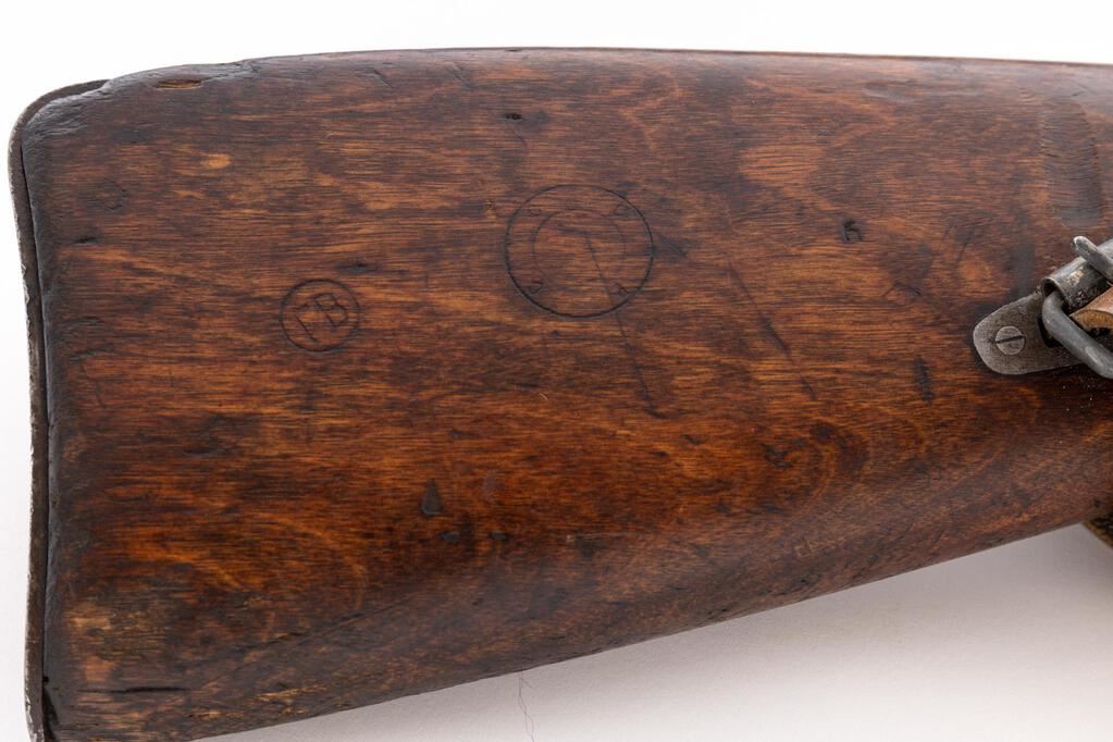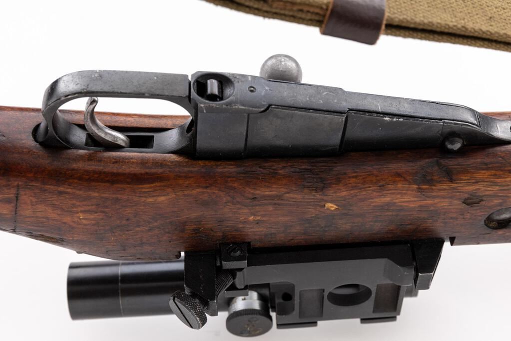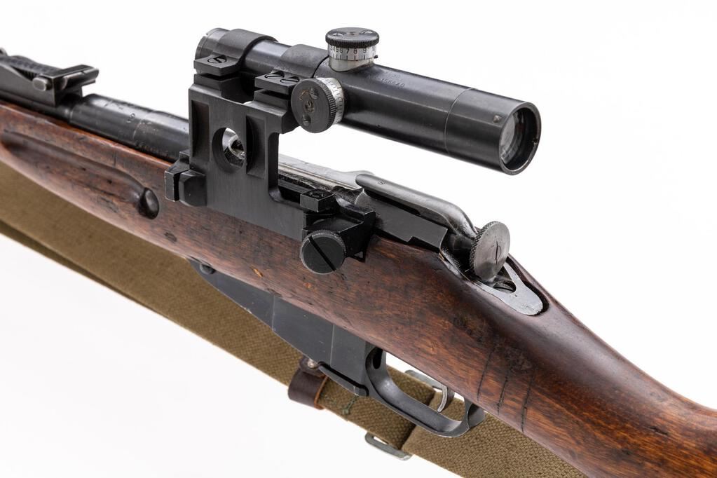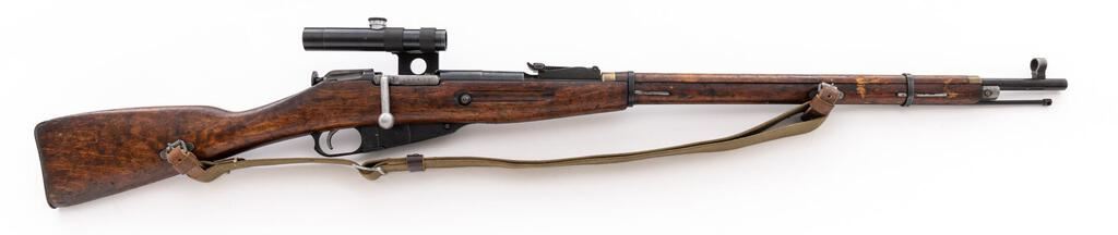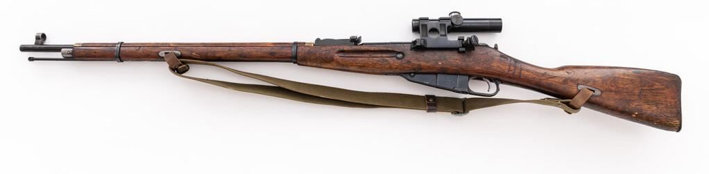 Finnish Property Marked Soviet Model 91/30 Mosin-Nagant Bolt Action Rifle, with PU Telescope, #170867, 7.62x54Rmm, 29" barrel, blued finish, hardwood stock, hooded post front sight and adjustable leaf rear sight. Cleaning rod mounted under the barrel, and a very good condition Soviet cotton sling is attached to the swivels. The bolt handle has been altered to look like a long turned-down sniper type by cutting and rewelding. Marked on top of barrel shank with the fletched arrow inside five-pointed star of the Tula Arsenal over "1936" and a stamped letter "D"; left side with "SA" Finnish property stamp. Right-side buttstock stamped with a circled "CCOP" cartouche forward of a circled "Rb" stamp. Matching numbers on receiver, barrel shank, and bolt; mismatched number on buttplate. Condition overall is very good with the metal retaining over 80% finish. Wear to the buttplate accounts for much of the finish loss. Forend and hand guard show scars and bruises to the right side, and three notches have been carved into the left side of the wrist, otherwise, the wood is good showing chips, handling marks, and scratches to the dark finish. Action operates smoothly, dark bore has light frosting and well-defined rifling. Import stamped on underside of barrel. The PU scope is marked "Star/Hammer & Sickle/Half Moon/91 30" and is numbered "No. b-156640", with round top turret screws. Mount is a reproduction. Condition overall is very good showing light scratches to the underside of the tube. Optics show a dull yellow color with a sharp reticle. Both knobs turn with effort. The mount is unmarked and is in excellent condition. Includes a very good condition leather lens cover and cotton scope cover. Est.: $700-$900. (C&R)