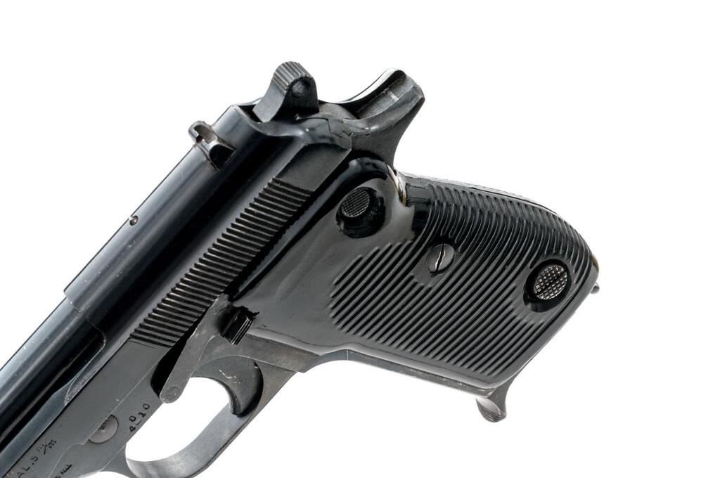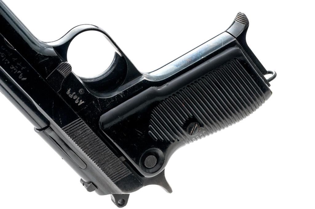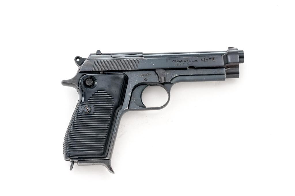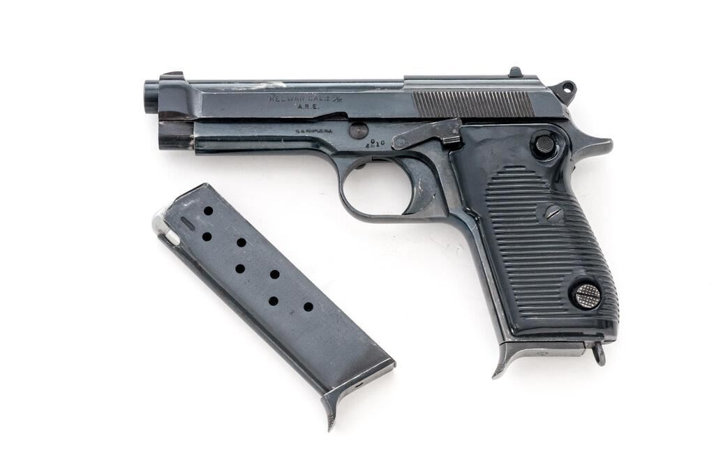 Egyptian Helwan Semi-Automatic Pistol, with 2 Magazines, #4010, 9x19mm, 4.5" barrel, blued finish, black plastic grips with horizontal grooves, blade front sight and drift adjustable rear sight with square notch. Magazine #1 is mfg'r marked on the spine and has a matching Arabic serial number engraved on the floorplate. Good condition with finish wear and frosting. Magazine #2 is mfg'r marked on the spine and has no serial number. Condition is good with patina to the floorplate. Pistol is marked "HELWAN CAL.9 m/m/A.R.E." on left-side slide and marked with Arabic script on right-side slide. Matching Arabic serial numbers on right-side frame and slide. Condition overall is very good with the metal retaining approx. 85% finish, with overall light scratches and handling marks. Grip panels have a gap in the rear where they don't fit together. Condition is very good showing mostly light handling marks and scratches. There is patina to the bolt face. Action operates smoothly, bright bore is very good with very good rifling. Import marked on left side of frame. Est.: $400-$600. (C&R/PPT)