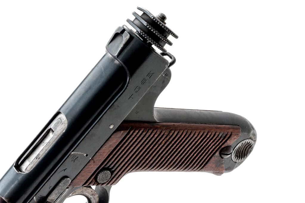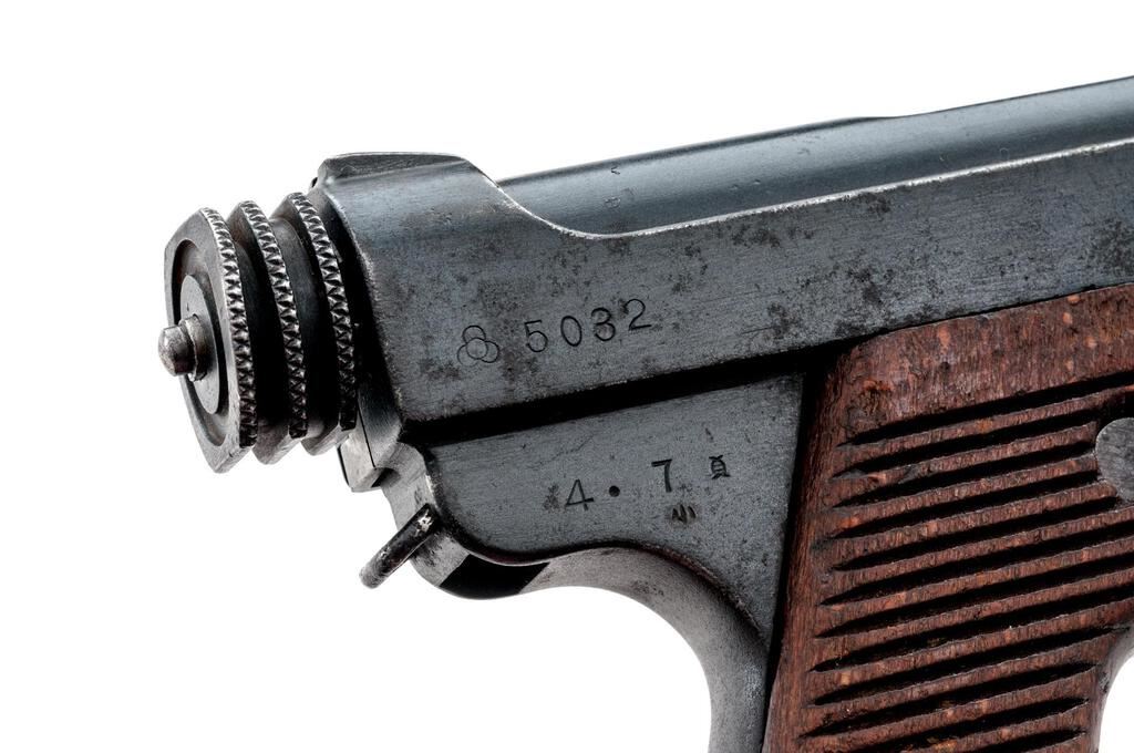 Early Japanese Type 14 Nambu Semi-Automatic Pistol, with 4 Magazines, #5032, 8mm Nambu cal., 4.75" barrel, blued finish, straw-finished trigger, all visible numbers matching except magazines, Koishikawa Arsenal proof marks, dated Showa 4.7 (July 1929), small round trigger guard, drift adjustable inverted "V" front sight, integral fixed rear sight with square notch, early type knurled cocking knob, lanyard loop, 25-groove beech wood grips with no visible serial number, has two different types of grip screws, two original non-matching number blued steel magazines with pot metal bases, and two original non-matching number nickel-plated magazines with aluminum bases. Beginning in 1934 these early pistols were recalled to fit a magazine safety. This gun has that modification. Condition is good retaining approx. 80% arsenal refinished rust bluing, with light pitting evident under the bluing, high edgewear to the muzzle, high edges of the slide and frame, trigger guard edges, scattered freckling on the slide sides, barrel, and sides of frame. Grip straps show heavy freckling and staining, typical half-moon scratches around the safety lever area to include a partial line on the left grip, rear segment of the cocking knob has a ding, and heavy wear and loss of finish to the straw on the trigger. Action, hold open, and safety all function properly; bore is lightly frosted overall with strong lands and grooves. Grips show age, soiling, minor dings and small gouges. One blued magazine is very good showing wear lines from use and oxidation to the base. The other blued magazine shows losses to the finish, freckling, pitting, and minor rust, with oxidation to the base. One nickel-plated magazine is very nice showing very light age and use, with minor dings on the base. The other nickel-plated magazine shows a few heavy rust spots, minor blemishes, and wear from use, with minor dings and soiling on the base. Est.: $600-$800. (C&R/PPT)
