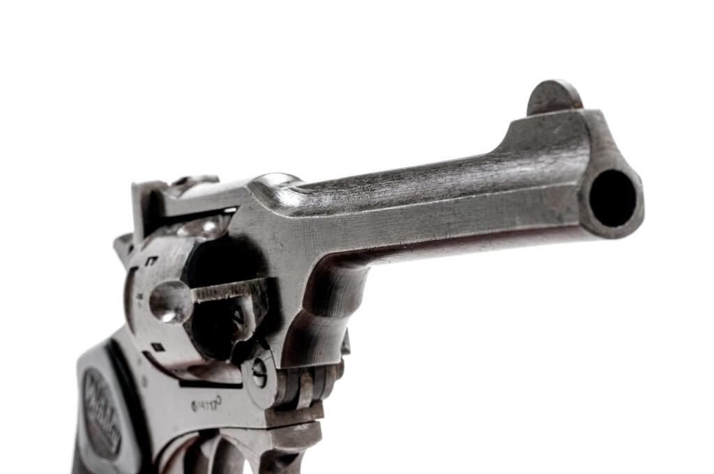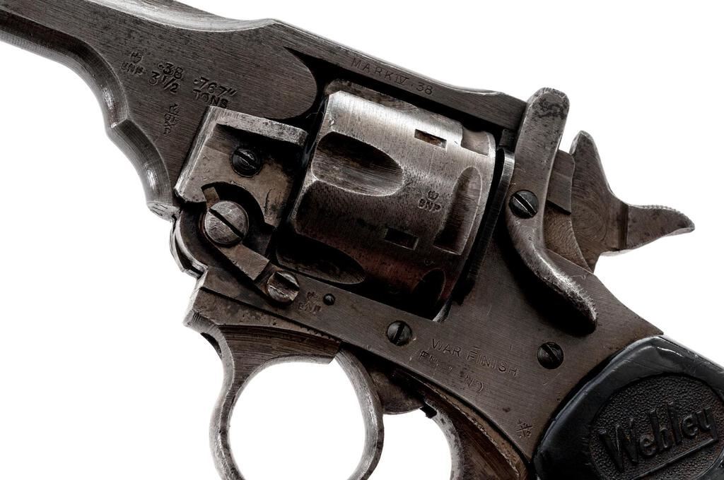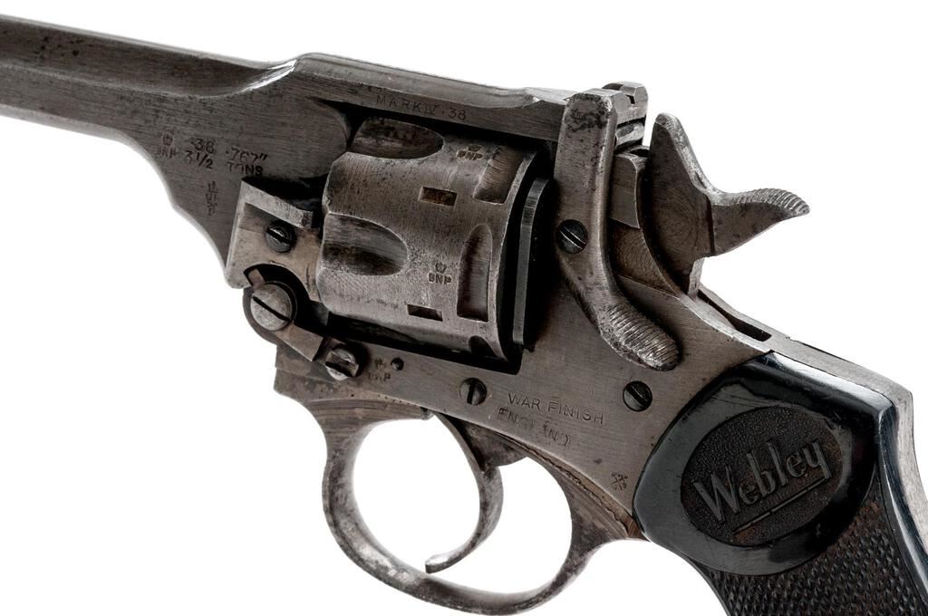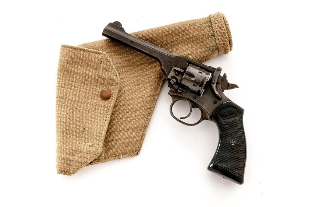 British Webley Mk IV Double Action Revolver, with Holster, #84217, .38 S&W cal., 5" barrel, blued finish, black plastic checkered grips with Webley logo on each side, blade front sight and fixed square-notched rear sight. Lanyard loop assembly has been removed from butt of grip. Marked "WEBLEY & SCOTT LTD" on top of barrel strap and "MARK IV .38" on left side; frame marked "WAR FINISH" and stamped with a "Broad Arrow" British Gov't ownership mark along with proof and view stamps. Matching numbers on barrel and cylinder. Condition overall is good. Most of the finish has been worn from the metal, which is now a dull color showing overall dark spots and patina. Grips are good with overall handling marks, chips, and flattening to the checkering. Action locks up, cycles, and extracts smoothly; bore has scattered small spots of patina, otherwise good, with very good rifling; chambers are clean and bright. Birmingham export proof marks stamped on left side of frame and barrel. The Australian made holster is ink stamped "H&Co.1944/D(Broad Arrow)D" under the flap and "(Broad Arrow)H" on the rear, with added penned writing on the forward edge. Holster condition is close to excellent showing bright colors with all stitching and metal intact. Est.: $500-$700. (C&R/PPT)