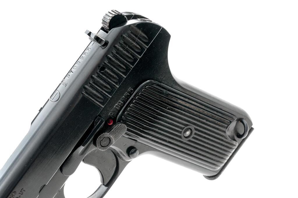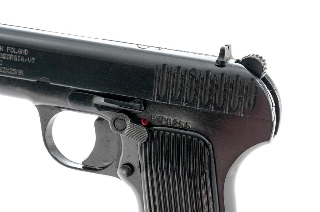 Polish TT-33 Tokarev Semi-Automatic Pistol, with 2 Magazines, #PTO9255, 7.62x25mm, 4.5" barrel, blued finish, black plastic grips with vertical grooves, blade front sight and drift adjustable rear sight with "U" notch. Safety lever added to left-side frame below slide stop. Magazine #1 is stamped "02" on the right side and has a lanyard loop on the floorplate. Condition is very good with light finish wear. Magazine #2 is stamped with a mismatched serial number and is in good condition with wear and areas of patina. Pistol is marked with a "(circle)11" arsenal code over "1952". Matching numbers on frame and slide. Condition overall is very good with the metal retaining approx. 95% arsenal reblued finish showing a few light scratches. Top right-side grip is missing, condition is otherwise good with chips and scratches to the vertical grooves. Action operates smoothly; bore has darkening in the grooves that may clean better, otherwise very good with very good rifling. Import engraved on left side of slide. Est.: $400-$600. (C&R/PPT)