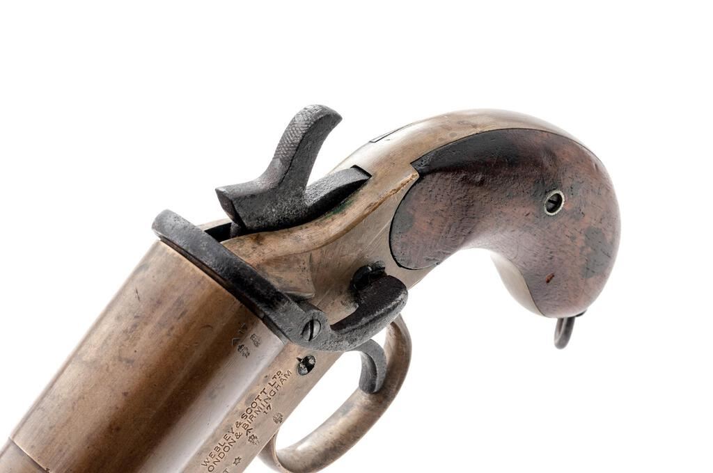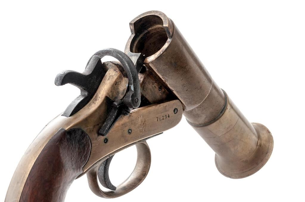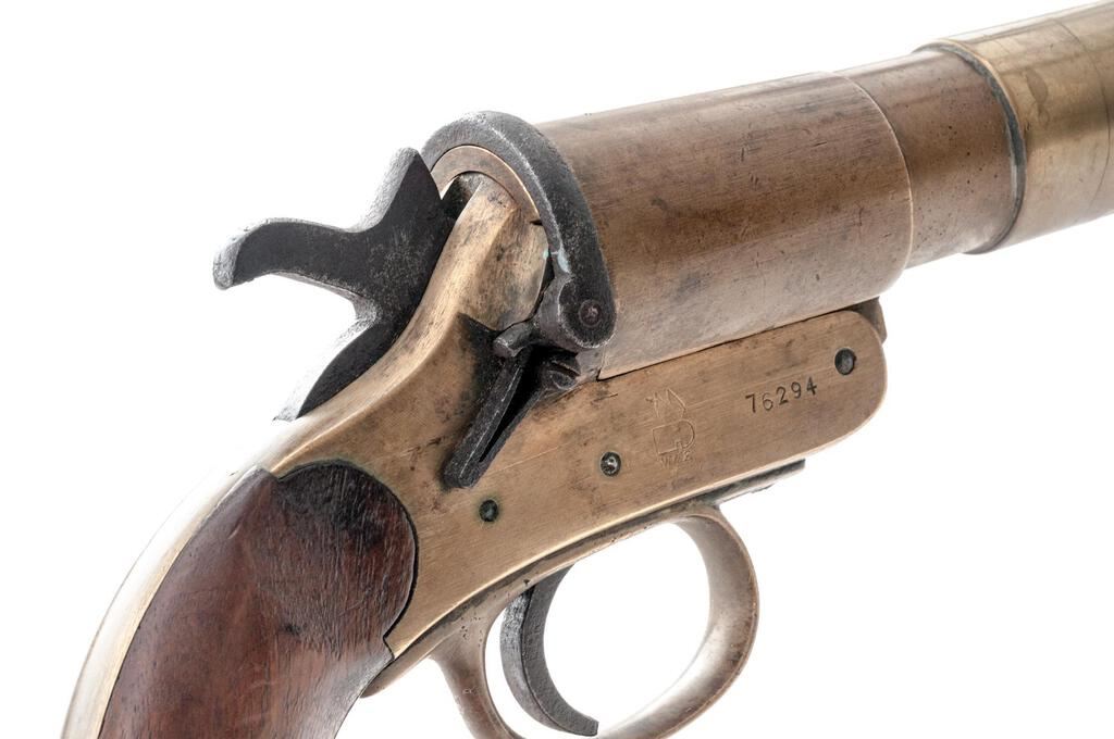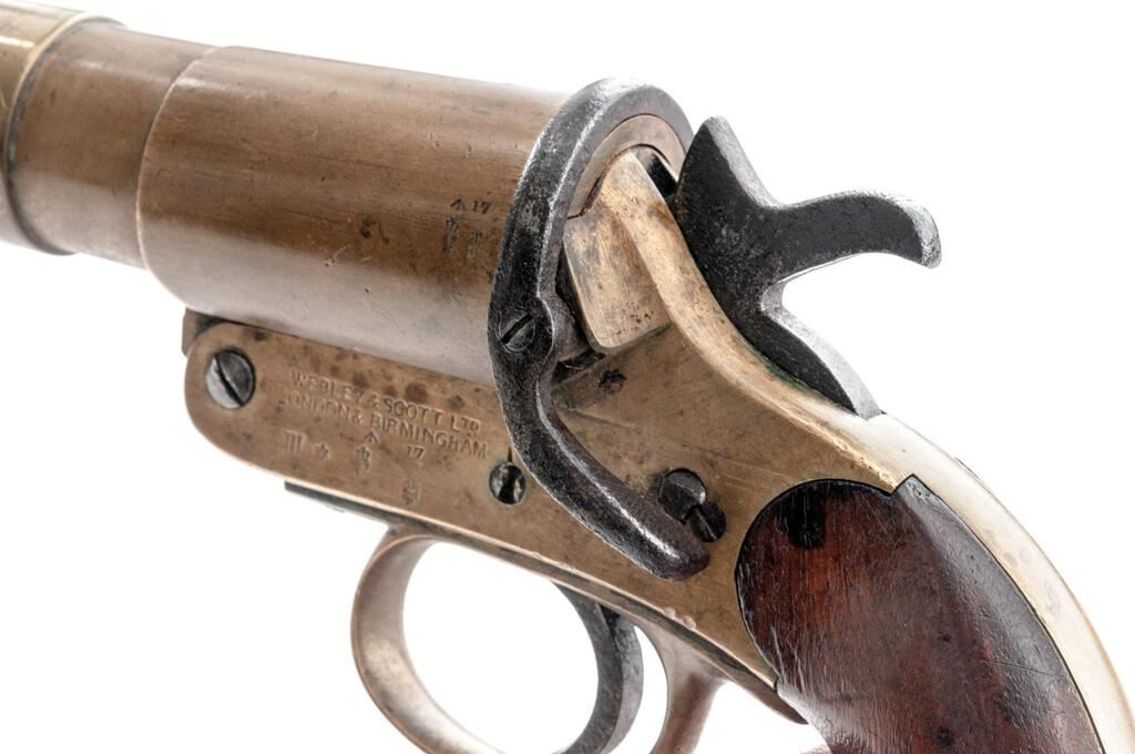 British Webley Mark III* Single Shot Flare Pistol, #76294, 1" bore cal., 5.6" barrel with bell, brass frame and barrel, smooth hardwood grips, no sights. Lanyard ring attached to bottom of grip. Marked on right-side frame with the Webley trademark "Winged Bullet/W&S" logo; left-side frame marked "WEBLEY & SCOTT LTD/LONDON & BIRMINGHAM" and "III*". Proof, inspection, and "?17" in-service marks stamped into left-side frame and barrel. Matching numbers on underside of barrel and extractor. Condition overall is very good, with the brass frame and barrel showing a few handling marks and a darkened patina. Steel hammer, trigger, and barrel stirrup have an overall patina. Grips have a few dark spots and show mostly light handling marks. Action operates smoothly; bore has some dark areas that may clean better, otherwise good. Est.: $250-$400. (Non-gun)