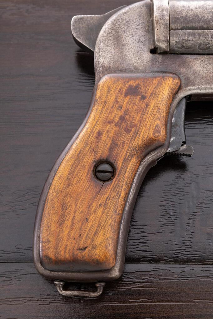 Lot of Two (2) WWII Russian SpSh-44 Flare Pistols, NVSN, 26.5mm bores, 5.9" barrels, stamped steel and welded construction, bottom checkered lever release, stamped triggers, external hammers, wood grips, marked with Soviet star in a shield, faint factory stamped marking, lanyard loops at bottom of grips, blued finish. 1.) Smooth wood grips with remnants of varnished finish, tight hairlines around the grip screw, remnants of bluing only in a few protected areas of frame, mostly a mottled brown patina, with light pitting and evidence of cleaning. Bore is lightly pitted near front half, action is weak, hard to lock up, trigger will not stay cocked. 2.) Smooth wood grips with initials "L U" carved into left grip, some varnish remaining on left grip, remnants of bluing on frame and barrel in some protected areas. Mostly mottled brown patina with scattered freckling, bore has light pitting overall, action works well, hammer and trigger function well. Est.: $200-$400/Lot. (Non-gun)