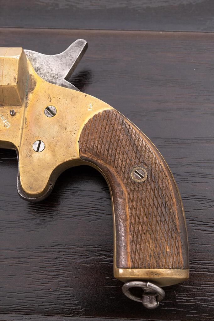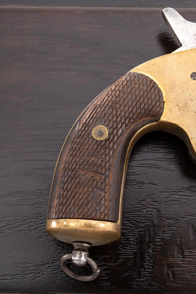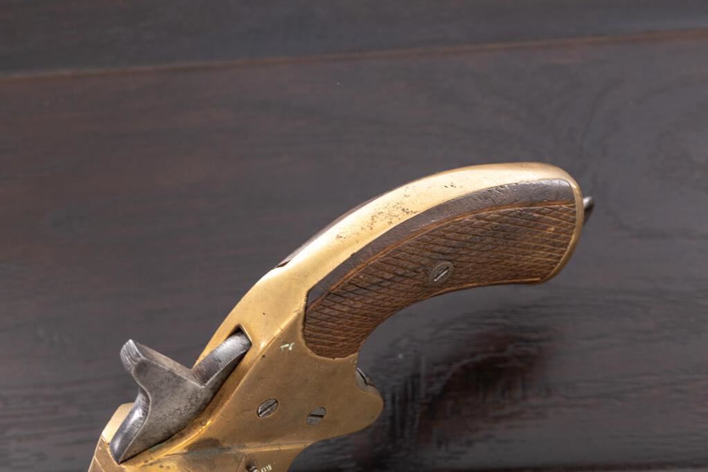 Lot of Two (2) WWI French M1917 Brass Flare Pistols, NVSN, 26.9mm bores, takes 25mm French flare cartridges, 4" barrels, brass body and barrels, steel external hammers, triggers, and side locking action levers, checkered wood grips, lanyard loop at bottom of grips, marked with a "V" on left side of frame and internal barrel lug. Made by G.G.&Cie (Grivolat Gerest Fils et Compagne). 1.) Frame and barrel have been cleaned and polished at some time in the past, showing numerous small dings and scratches. Steel parts show age graying and scattered light freckling with some cleaning. Action is very tight to open, hammer and trigger work well, nice bore. Action lever screw may be an old replacement. Grips have some vertical lines carved into them at the edges and show some scratches and small gouges. 2.) Frame and barrel have been cleaned and polished at some time in the past, now toning down nicely, showing numerous small dings and scratches and a nice bore. Steel parts show age graying and scattered freckling with some cleaning. Action is very tight to open, hammer and trigger work well. Grips show some age darkening, light dings and minor scratches. Est.: $300-$500. (Non-gun)