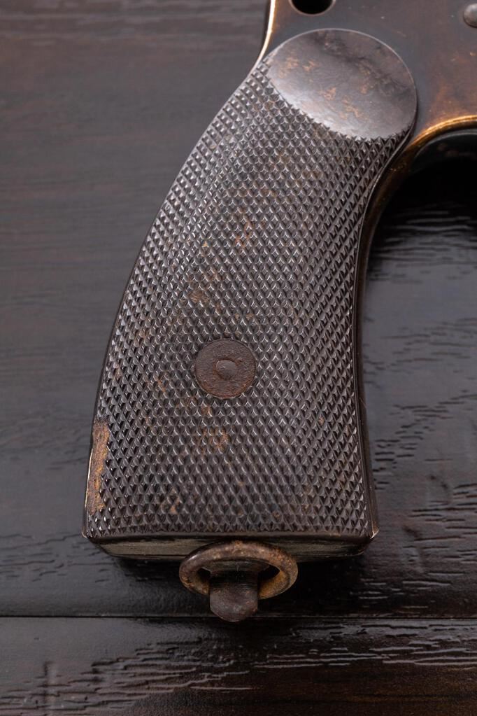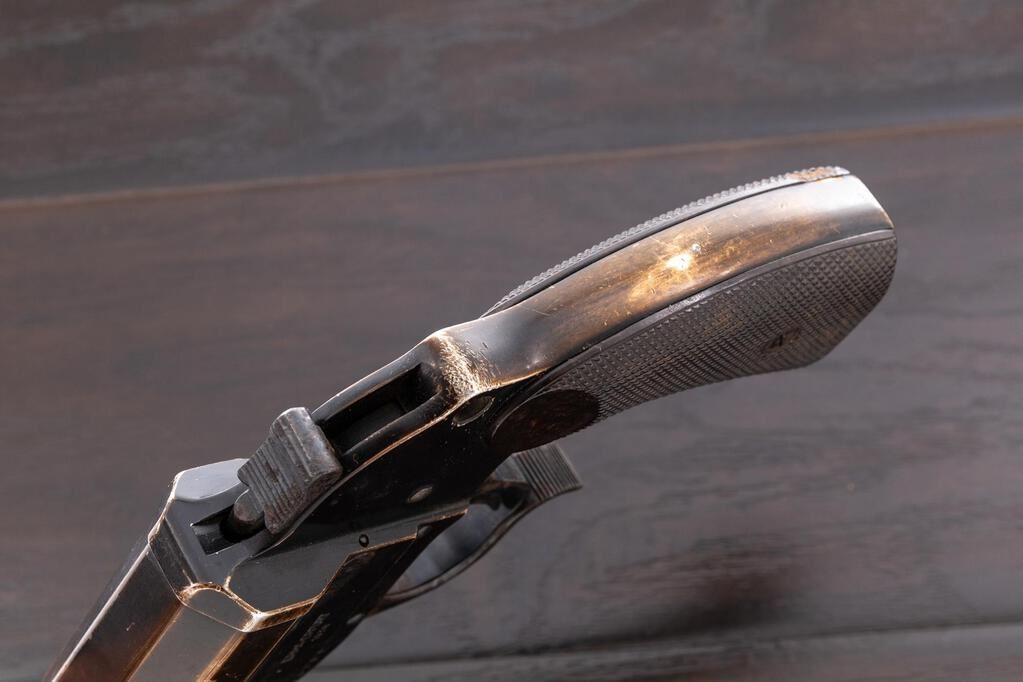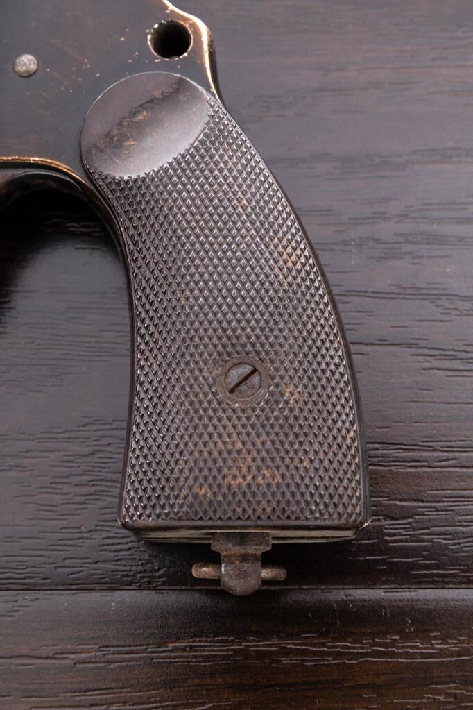 WWII German Leuchpistole 34 Flare Pistol, #7275b, 26.5mm bore, 6.1" barrel, aluminum, black anodized finish, underlever cocking mechanism, blued trigger, trigger guard, and cocking lever, external hammer, maker marked "ERMA-ERFURT" and dated 1938, Weimar eagle firing proofs and "(eagle)77" waffenampts on barrel and frame, lanyard ring at bottom of grip, and dark brown Bakelite checkered grips. Condition is good, the barrel finish fading to a golden color, high edgewear to the finish on the frame, front and rear grip straps fading to gold color, numerous light scratches, dings and wear. The blued trigger, trigger guard, hammer and cocking lever shows heavy rust freckling. Bore is frosted near the front half, and there is a large dent at the mouth of the barrel. Action opens ok, and the hammer and trigger work properly. Grips show soiling, light age, scratches, and a few flattened diamonds. Est.: $200-$300. (Non-gun)