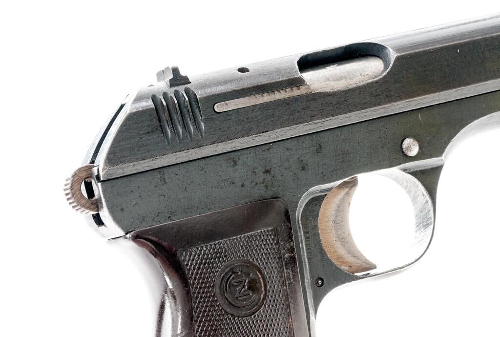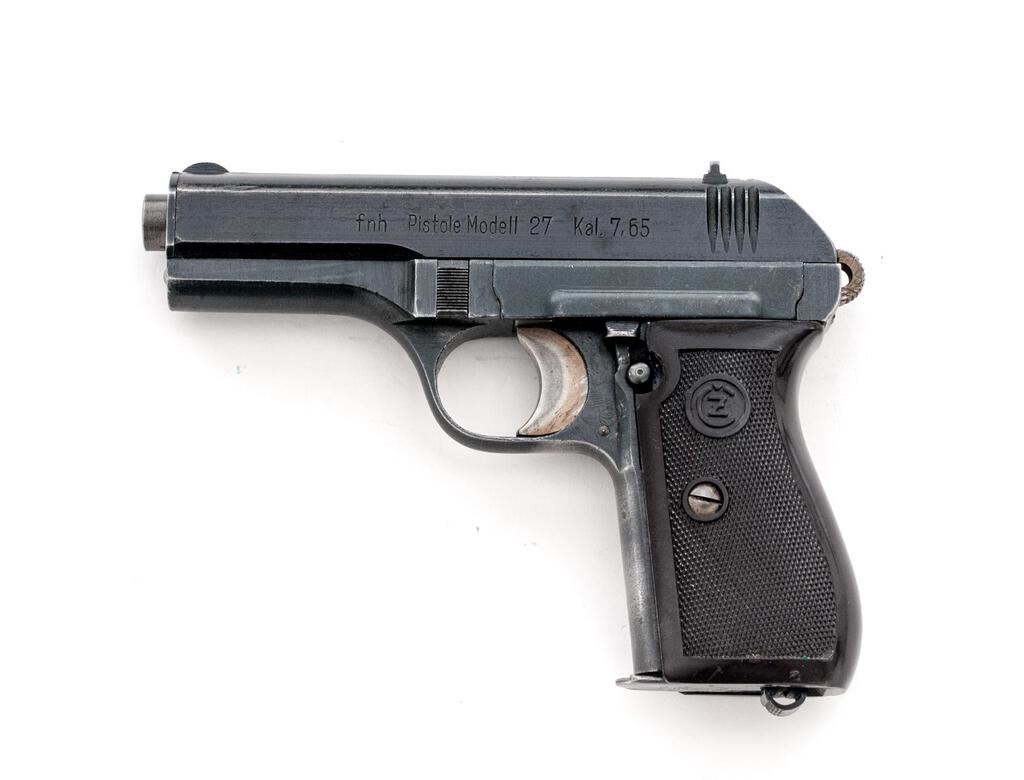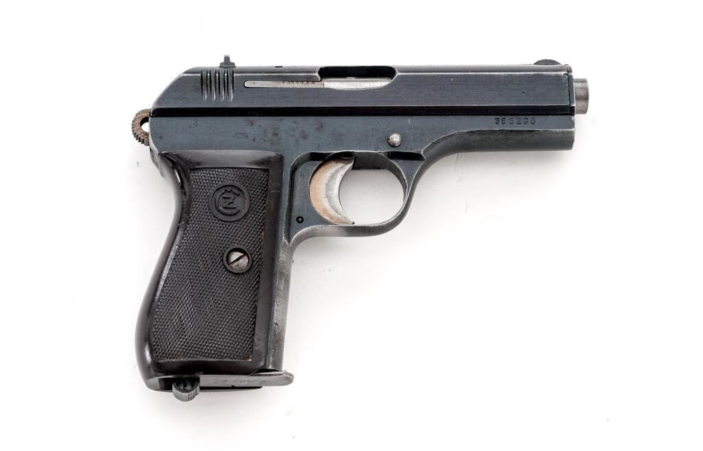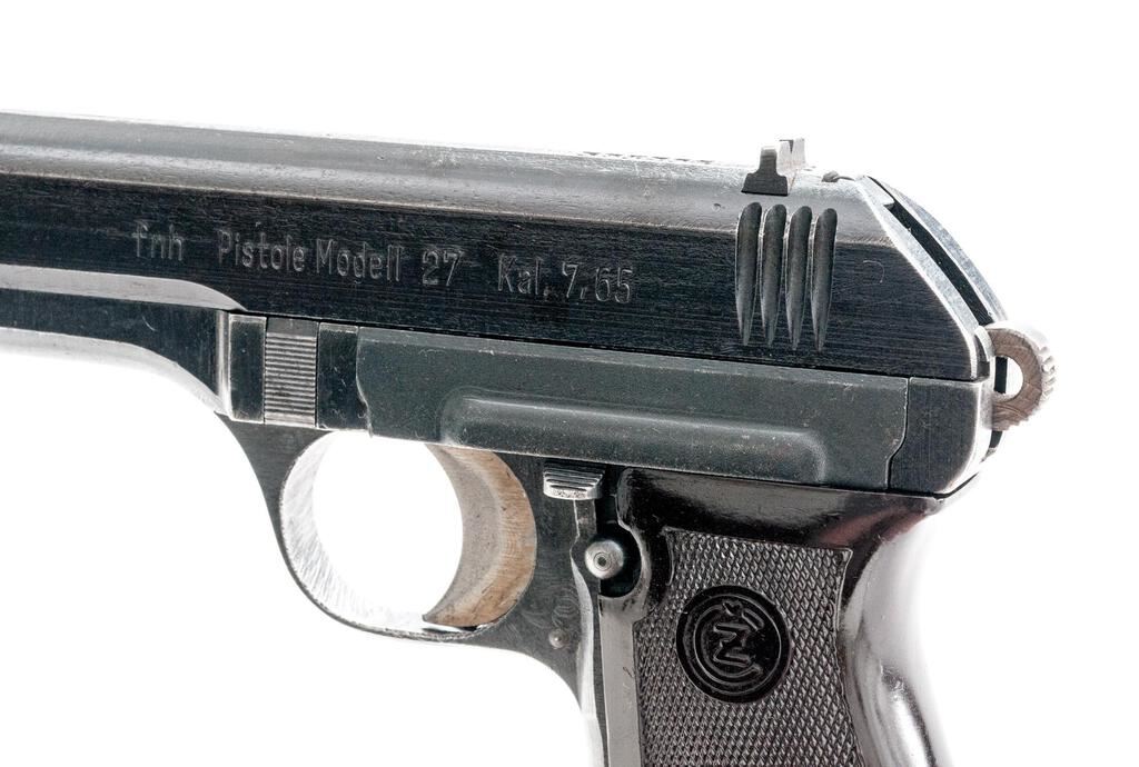 Czech CZ-27 Semi-Automatic Pistol, with Holster and Extra Magazine, #385296, .32 ACP cal., 3.9" barrel, blued finish, checkered one-piece dark red plastic grip with CZ logos on each side; blade front sight and drift adjustable rear sight with "V" notch. Pistol is marked on left-side slide "fnh Pistole Modell 27 Kal.7,65". Right-side frame marked with "WaA76" waffenampt stamp. "Eagle/Swastika" marks are stamped on top of slide and on barrel at ejection port. Both magazine floorplates are marked "P.MOD.27". Brown leather holster is marked on rear with large "P.Mod.27" along with a "CZ" logo, "(eagle)/WaA 76" waffenampt and "1942". Holster condition is good with the pliable leather showing handling marks and scratches to the dark finish. Extra magazine has a bent floorplate, otherwise good. Pistol has matching numbers on frame and slide. Pistol condition overall is very good with the metal retaining over 80% finish, showing wear to the front strap and rust patina spots to the frame and slide. The straw-colored hammer and trigger show darker toning. Grip is very good with a small chip and showing light handling marks to the checkering. Action operates smoothly, bright bore is excellent with well-defined rifling. Both of the magazines have bent floorplates and wear to the finish, otherwise good. No visible import marks. Est.: $500-$750. (C&R/PPT)