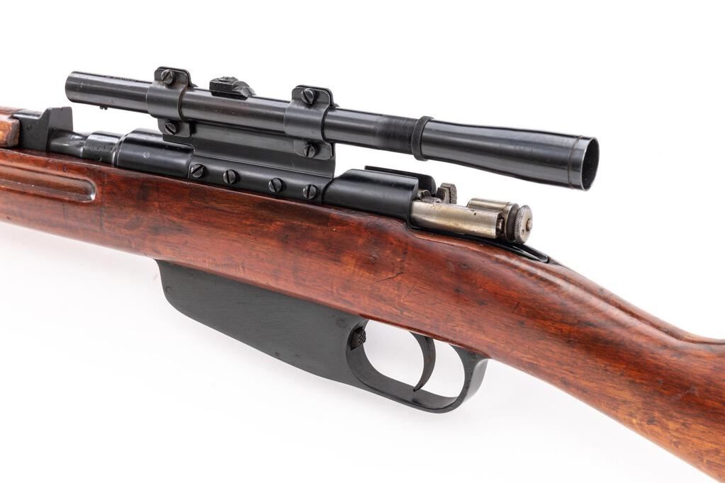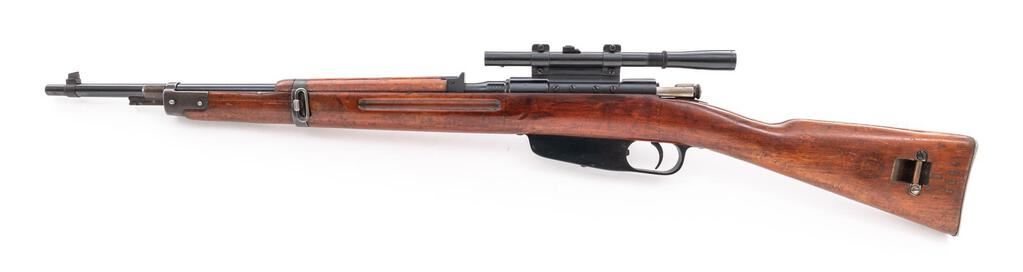 Italian Model 1938 Carcano Infantry Rifle, with Scope, #D3219, 7.35x51mm, 20.9" barrel, blued finish, hardwood stock, inverted "V" front sight and fixed "V"-notched rear sight. Marked faintly on top of barrel shank "(Crown)/R.E./TERNI", and on right side with Fascist "1939 XVII". A later Finnish "SA" property mark is stamped on the left side. There is an unreadable cartouche on the left-side buttstock forward of a mismatched serial number. Condition overall is very good as reconditioned, with the metal retaining approx. 90% reblued finish, the barrel and receiver polished bright, and some parts showing browning or spots of patina. Wood has been sanded and varnished, now very good, showing old and new handling marks and scratches. Action operates smoothly, bright bore is very good with very good well-defined rifling. Scope is marked "PAN-TECH JR. ENCINITAS.CALIF.". Scope condition is good with areas of patina present on the tube; optics are clear and bright. Est.: $400-$600. (C&R)