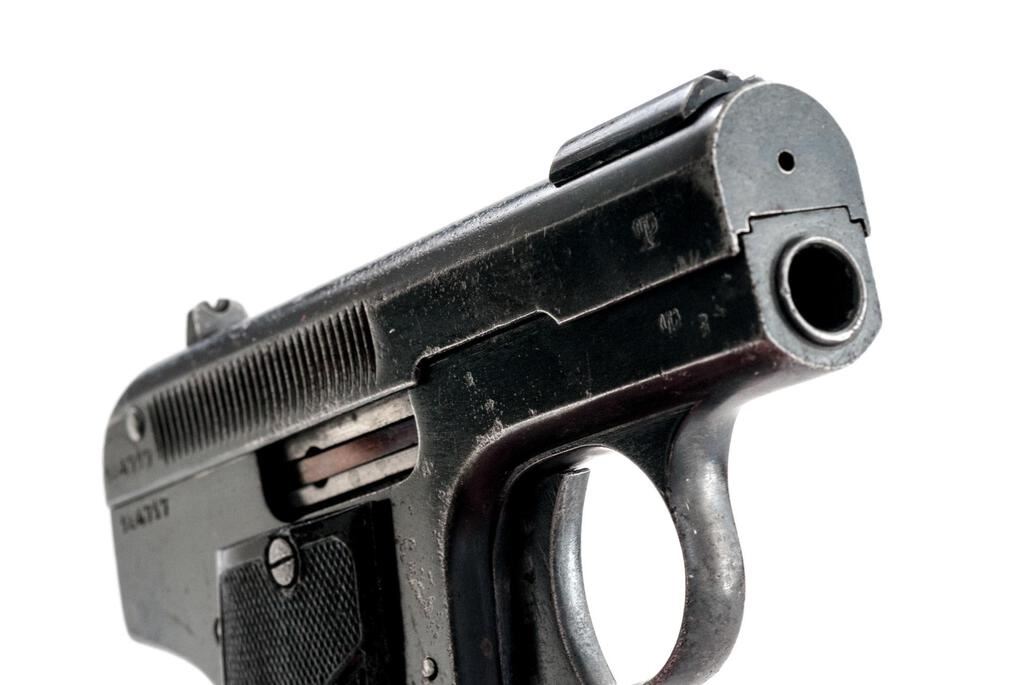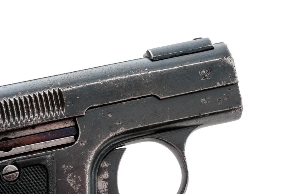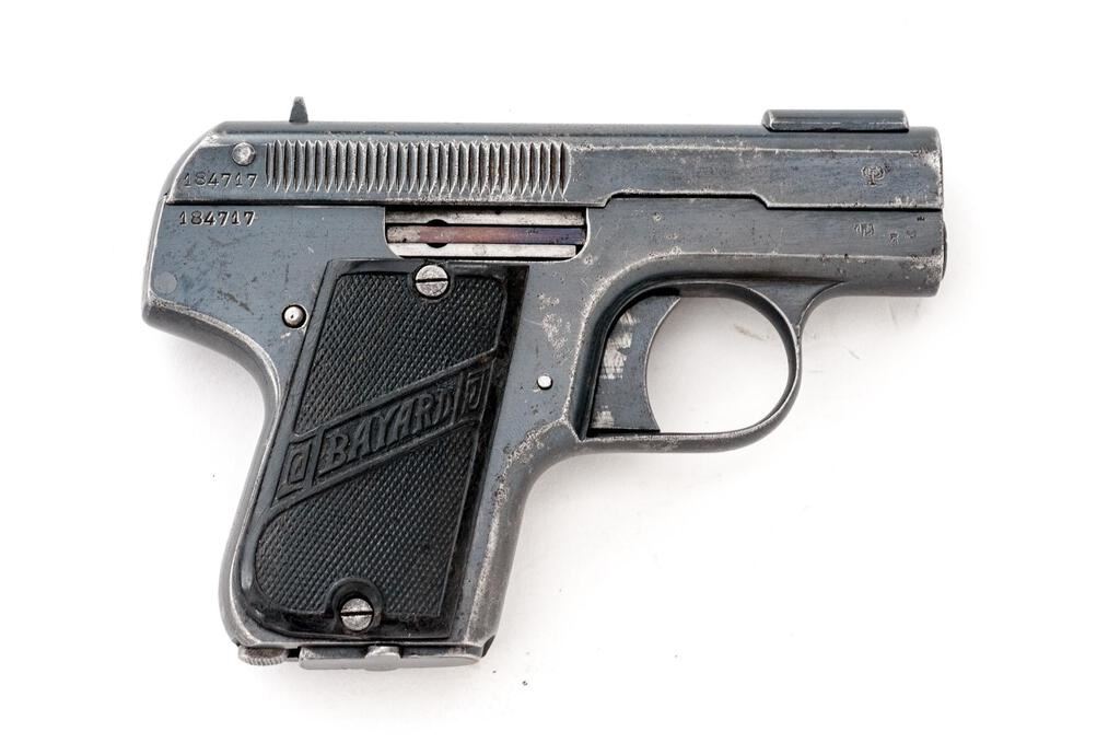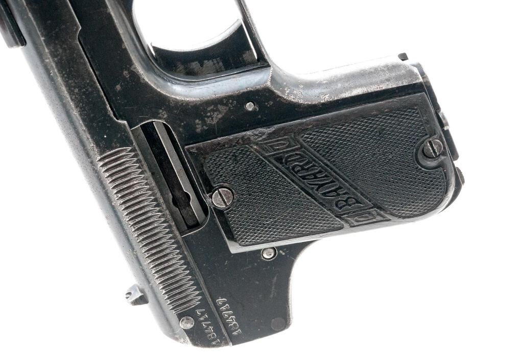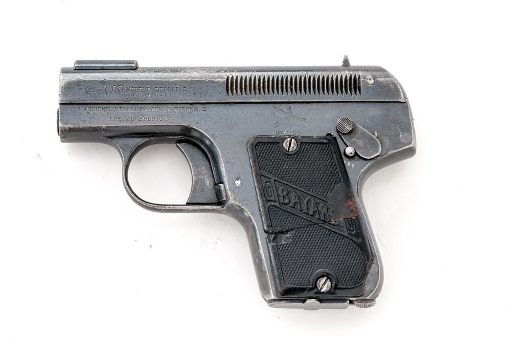 Belgium Bayard M1908 Semi-Automatic Pistol, #184717, .32 ACP cal., 2.25" barrel, blued finish, fixed blade front sight and fixed rear sight with small "v" notch, slide marked "Cal 7.65 Modele Depose", frame marked "Aciens Etablissements Peiper" Herstal-Belgium, Brevete patent info and date 1908 on top of slide, horse and lancer logo on frame, Imperial German eagle proofs on front of slide and frame, with "(crown)/F" proof. Hard rubber black checkered grips with "Bayard" lettering. Bottom mag release with one blued steel original magazine. Condition is fair retaining approx. 60% original finish, with wear and pitting to the top of the slide, freckling on sides of the slide, some pitting and dings on sides of the frame, pitting and wear on front and rear grip straps and trigger guard, and wear from use on sides of the trigger. Action and safety function properly, bore is heavily frosted with strong lands and grooves. Right grip is good showing scratches and minor gouges; left grip is broken in two and glued, with chipping, scratches, and losses at the bottom edge and top corner. Magazine shows wear from use and light rust on one side. Est.: $250-$400. (C&R/PPT)