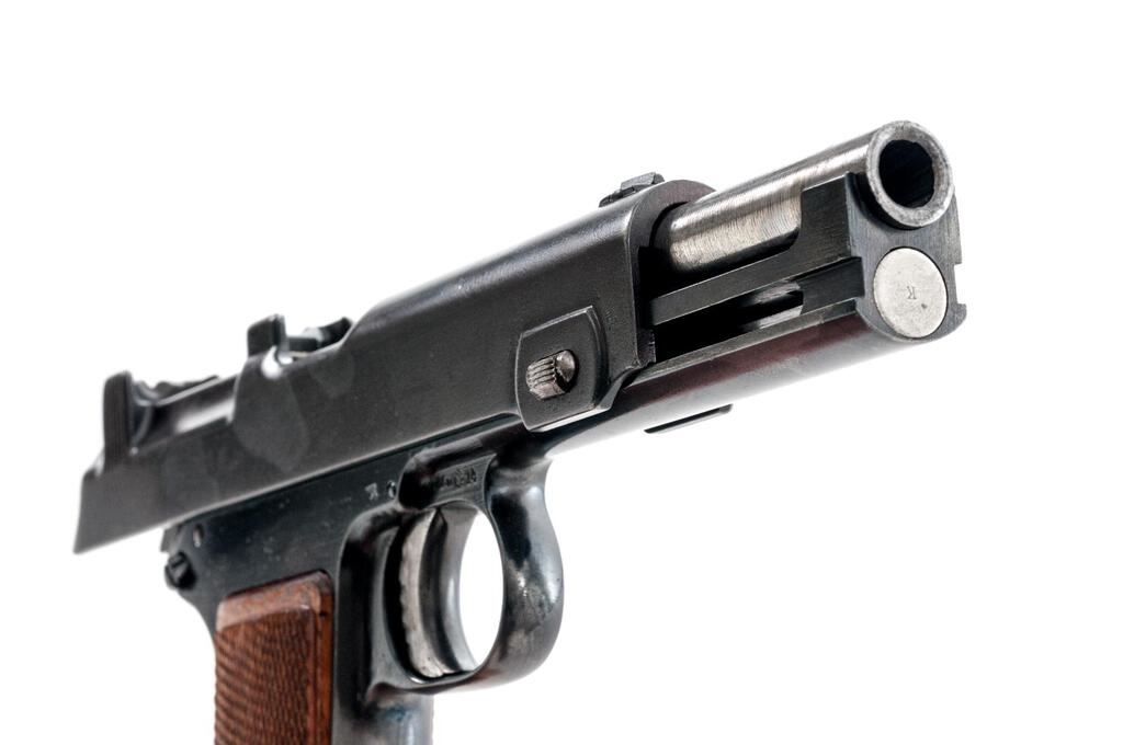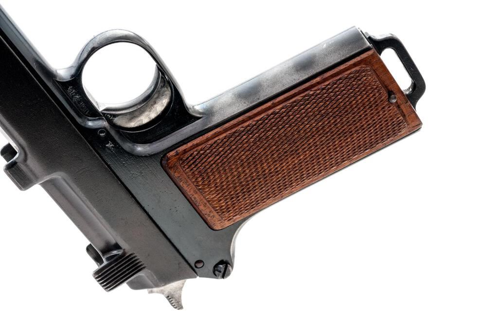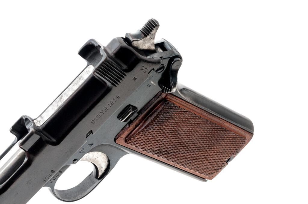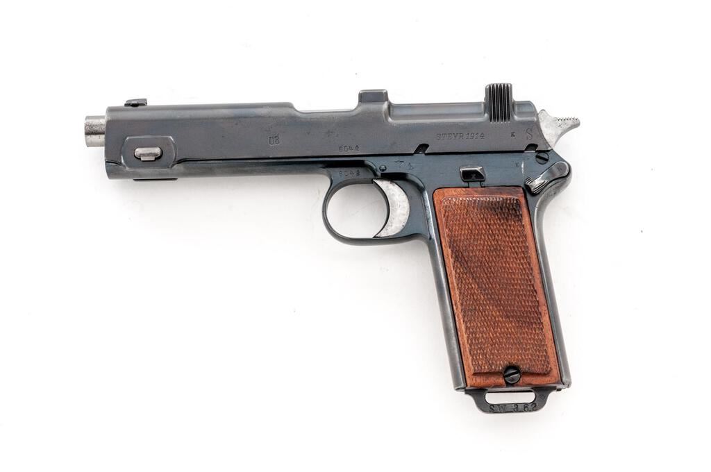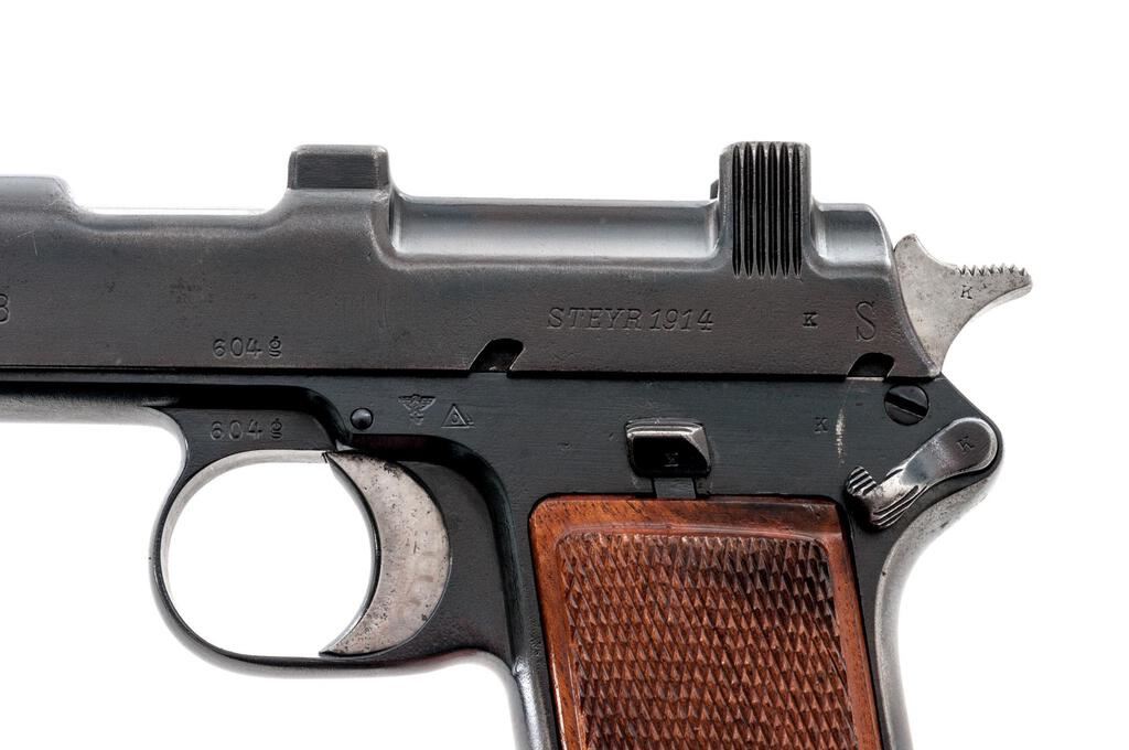 Nazi Police Marked Steyr-Hahn Semi-Automatic Pistol, #604g, 9mm Luger cal., 5-3/16" barrel, blued finish, polished barrel, engine-turned finish on trigger, top spring, and hammer; internal magazine, drift adjustable blade front sight and fixed integral rear sight with "V" notch, slide marked "08" denoting conversion to 9mm Luger cal., original Austrian eagle proof and "Wn.14" marking at trigger guard, small parts and slide marked with a "k", Nazi "(eagle)N" firing proof on left side of frame, Nazi Police "(eagle)L" proof mark on right side of frame, "SW 362" stamped into lanyard loop at bottom of grip, and checkered wood grip panels. Condition is very good as refinished/re-blued, the frame and slide showing some polishing that did not remove all the previous pitting and scratches. Slide has a duller gray blue finish than the frame, with no appreciable wear to the slide. Frame shows thinning to gray on the front and rear grip straps and bottom of trigger guard. Barrel is polished in the white. Trigger, hammer, and top spring are polished with an engine-turned machined bright finish. Action, hold open, and safety function properly; bore is mostly bright with a light frosting that may improve with a good cleaning. Grips are very nice with crisp checkering and a light varnished finish. Est.: $500-$700. (C&R/PPT)