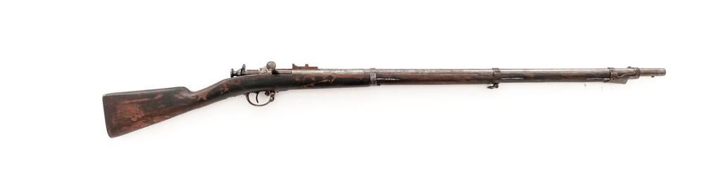 Scarce Antique Carcano Model 1868 Needle Fire Rifle, #953, converted from percussion, 17.5mm, 37.25" rifled barrel, straight grip nearly full-length wood stock with steel buttplate. Small blade front sight, rear sight base only. Sling swivel mounted to the middle band and front of trigger guard. Right side is dated, what looks like "1864". Large upside down "26" is stamped on right side of the buttstock with smaller horizontal "3728". There is an illegible proof mark on the old percussion base, small numbers stamped on inside of the trigger guard. After the noticeable battlefield success of the Dreyse needle fire rifle. The Italians began these conversions in 1867, using Salvatore Carcano's system. Condition is good with scattered areas of rust patina and moderate pitting to the metal. Heavier rust is present on the rear sight base. Wood with dark staining throughout, scattered dents and scratches. There is a crack to the right side of the forend that runs the full length, between the front and mid-barrel band. Action is stiff and functions but not smoothly. Needle sticks approx. 1/8" past the bolt face. Rifling is visible but the bore is dark with heavy frosting and some visible erosion. Hard to find in any condition. Est.: $700-$900. (Antique)