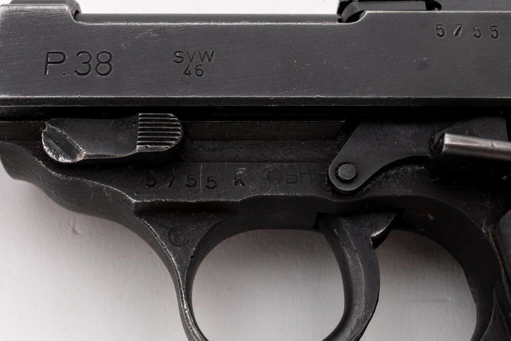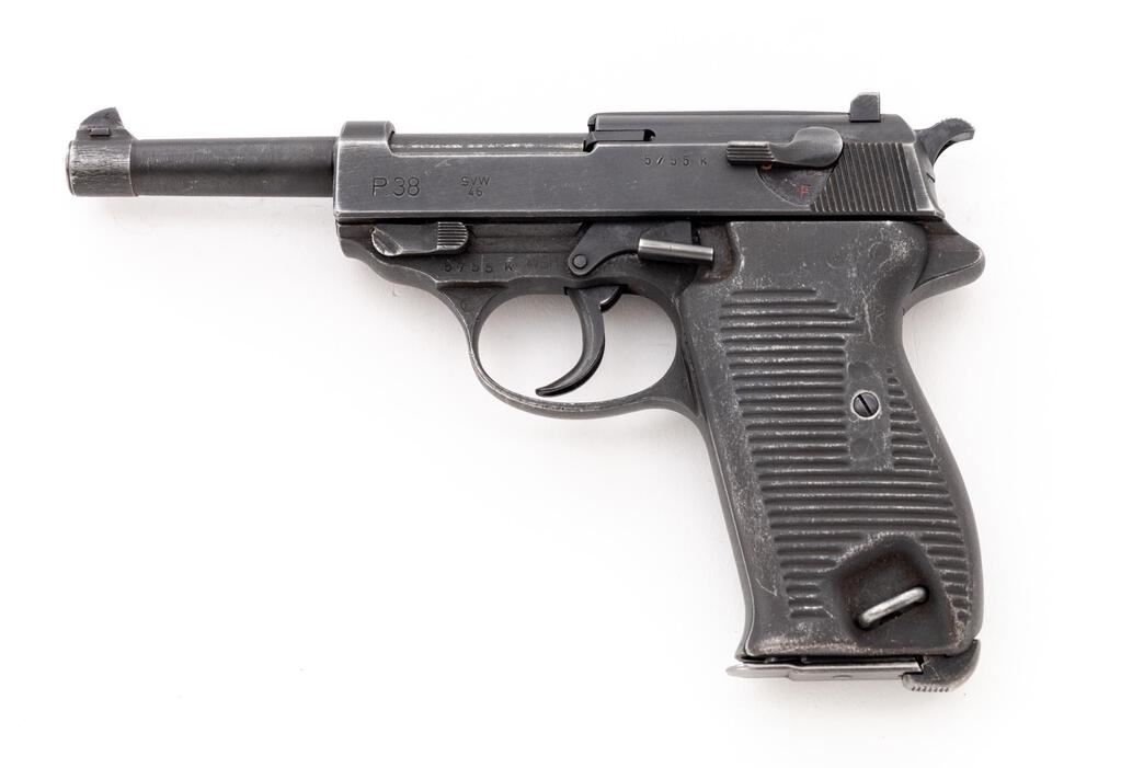 Post-War French Production P-38 svw-46 Semi-Automatic Pistol, #5755k, 9mm, 5" barrel, dark gray phosphate finish, double action, French star proof on slide, hammer drop safety, drift adjustable blade front sight and fixed rear sight with small "u" slot, all visible numbers matching, post-war Austrian eagle and BH police stamp on frame above the trigger guard, small round proof on trigger guard edge; lanyard loop, bottom mag release, gray metal grooved grips, and one blued steel magazine marked P.38v, serial number 3682, and faint "(eagle)359" proof on back spine. Condition is near excellent retaining approx. 95% original gray phosphate finish, with wear at the sides of the muzzle, tops of sights, high edges of slide, trigger guard edges, tips of the hold open and safety levers; front grip strap is very strong showing almost no wear, edgewear to the mag release and lanyard loop. Action has old dried oil and grease that makes it a bit sluggish, but a good cleaning should remedy that; bore is bright with just a hint of frosting. The hold open works if you push up slightly on the magazine, with another mag in place it functions properly. Hammer drop safety is a bit gummy but works properly. Metal grips show some high edgewear and minor scratches. Magazine shows only light wear from use. Est.: $600-$900. (C&R/PPT)