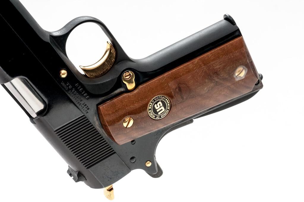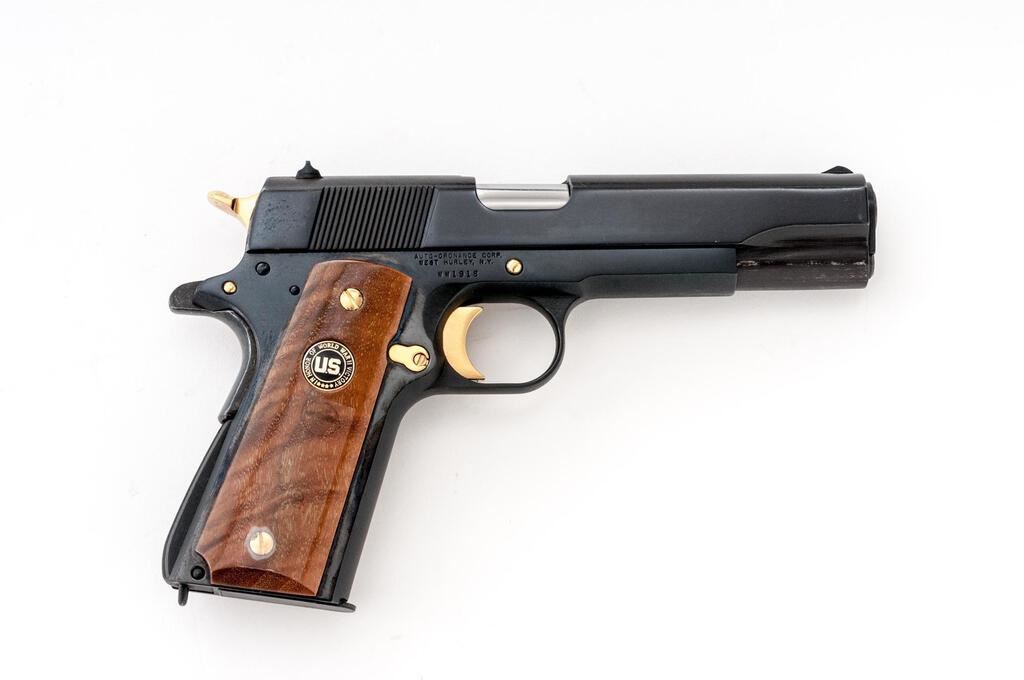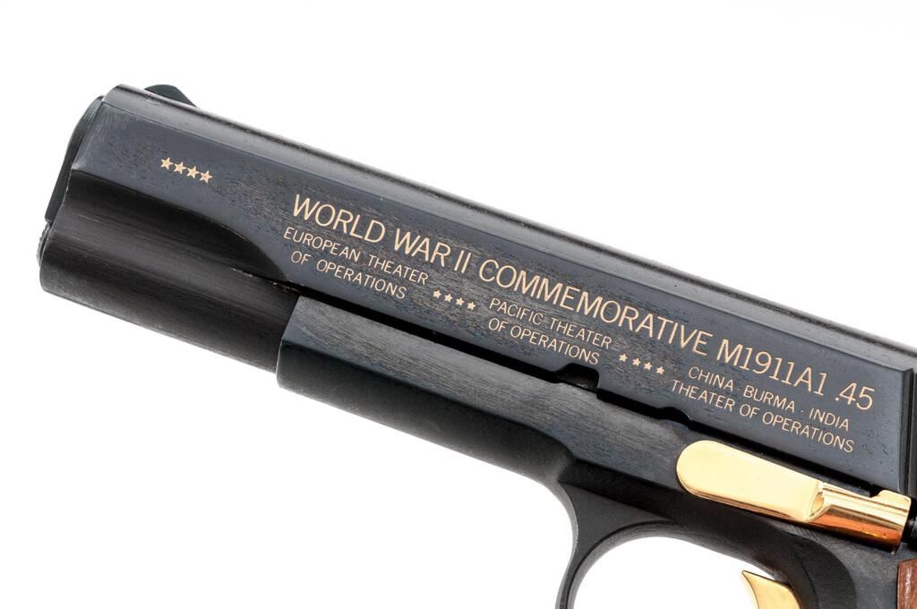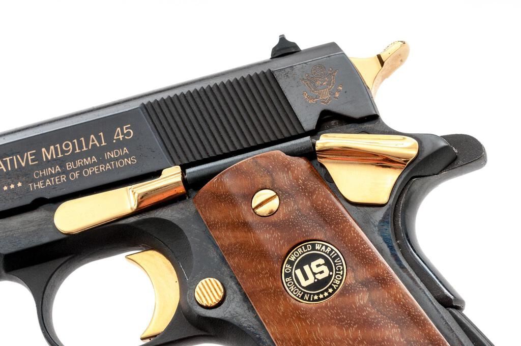 Auto-Ordnance M1911A1 WWII Commemorative Semi-Automatic Pistol, #WW1918, .45 ACP cal., 5" barrel, blade front and fixed rear sights, blue with gold script finish, smooth wood two-piece medallion grips, gold trim on slide stop, manual safety, trigger, hammer and magazine ejector button, lanyard ring, and 7-rd. unmarked magazine. Pistol is in fine overall condition with light scratches, mars, and handling marks. Slide lists in inlaid gold script the WWII Theaters of Operation, with a sharp Ordnance eagle at rear of slide. Smooth wood medallion grips are very good. Action is crisp, bore is good. Est.: $600-$800. (Modern) (Not available to Calif. residents.)