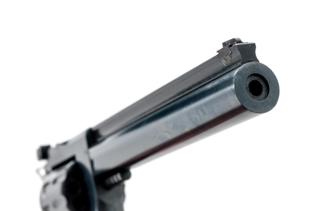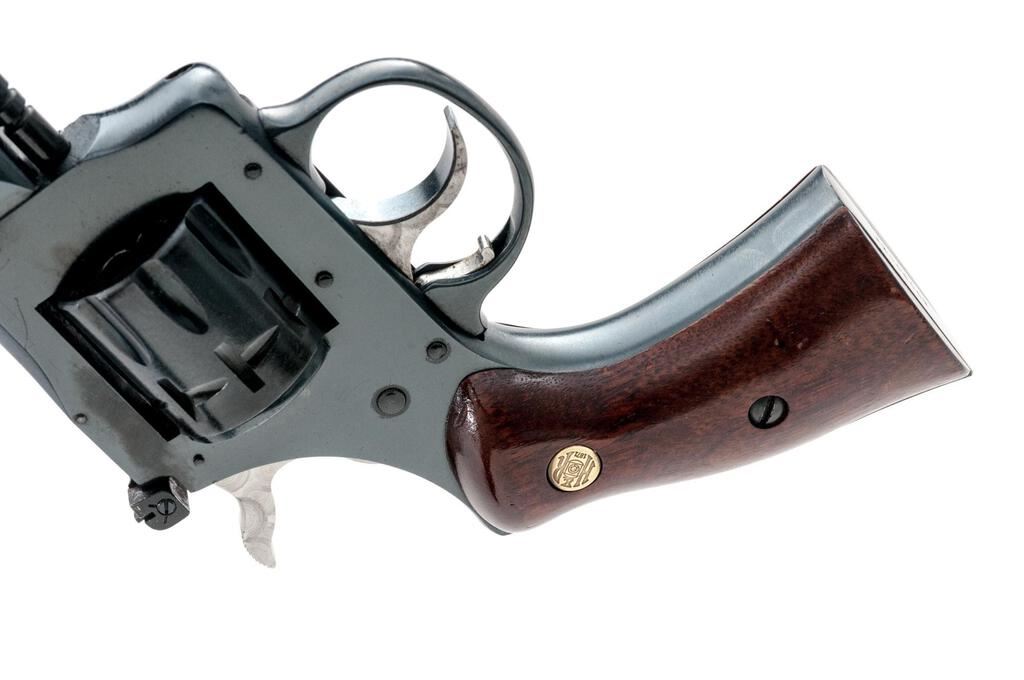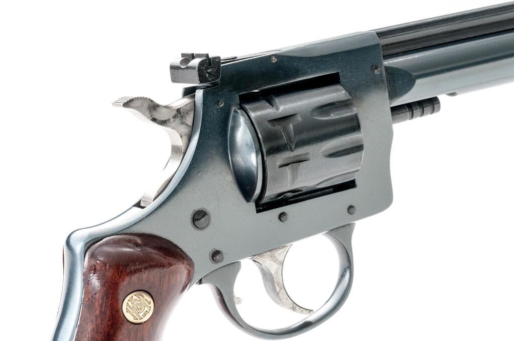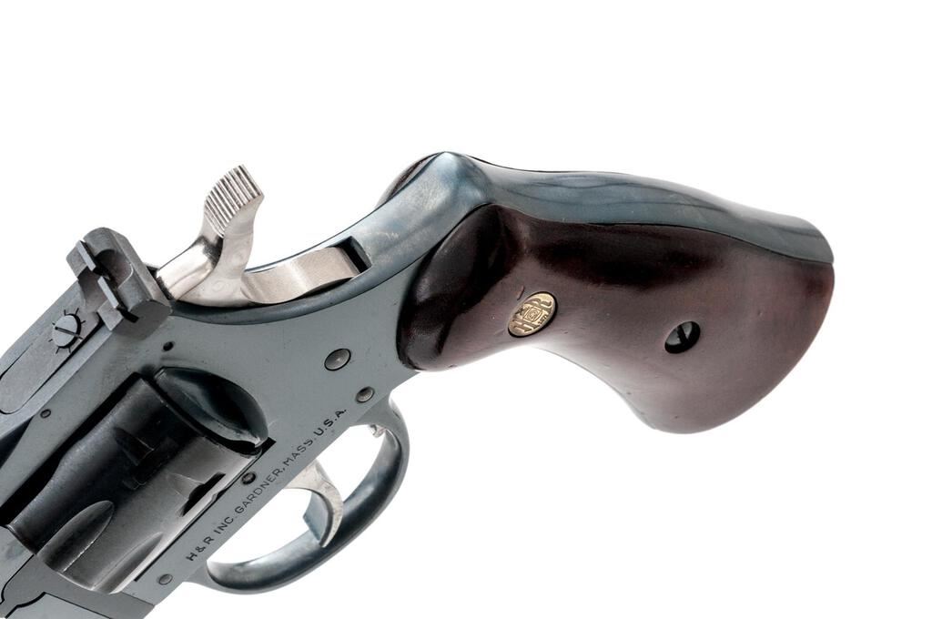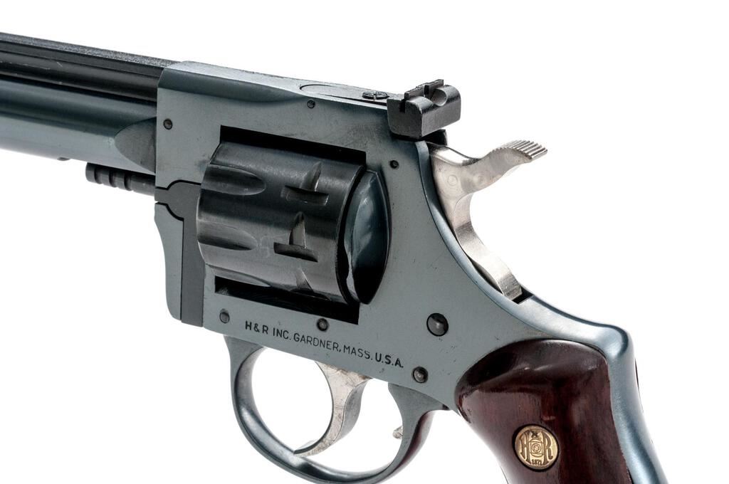 Harrington & Richardson Model 904 Double Action 9-Shot Revolver, #AZ006057, .22 LR cal., 6" barrel with a full-length rib, blade front and adjustable rear sights, blue finish, smooth wood two-piece H&R medallion grips, engine-turned trigger and hammer. Mfg'd 1980-1985. Revolver is in excellent overall condition showing little use, retaining approx. 98%-99% factory finish with light handling marks. Grips are near excellent with small mars. Action is crisp, bore is very good. Est.: $250-$400. (Modern/PPT)