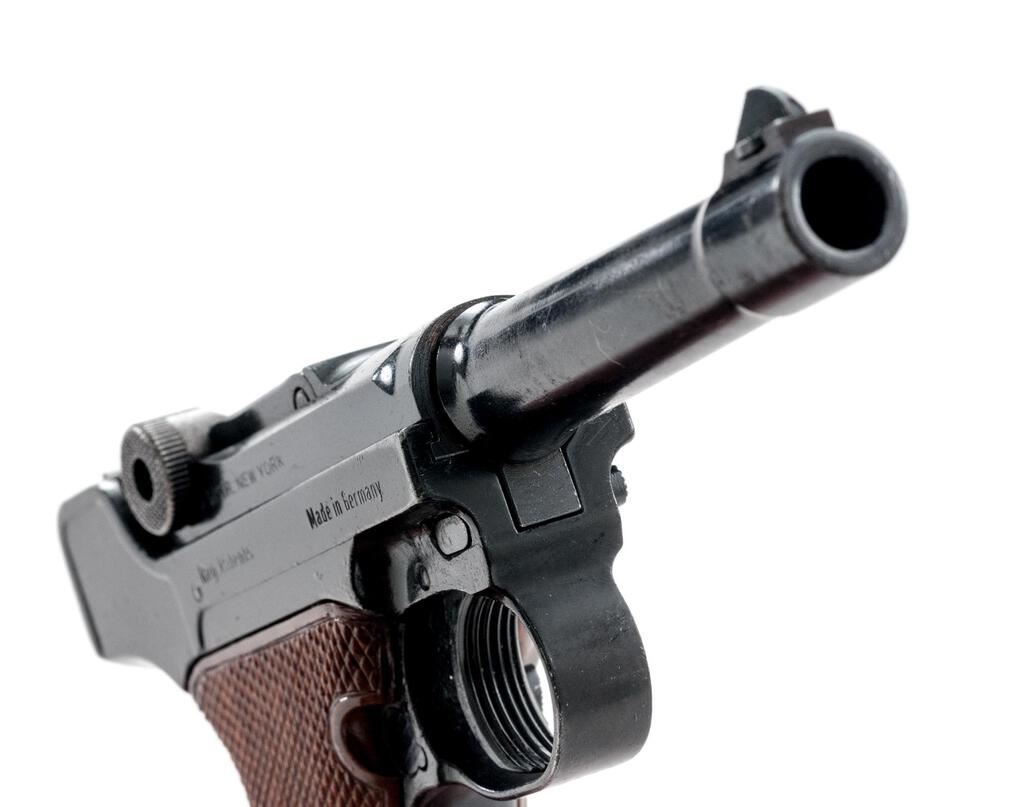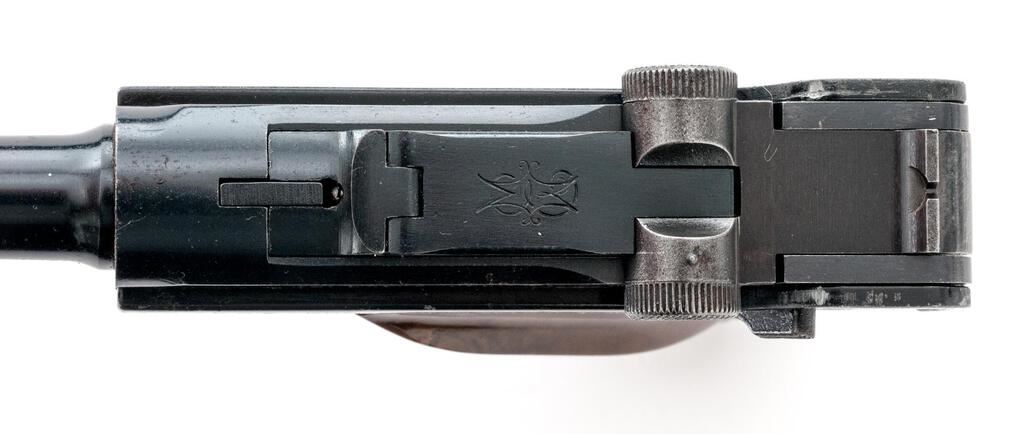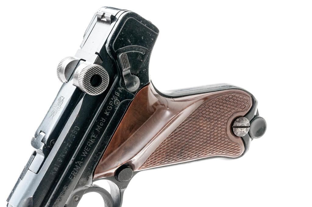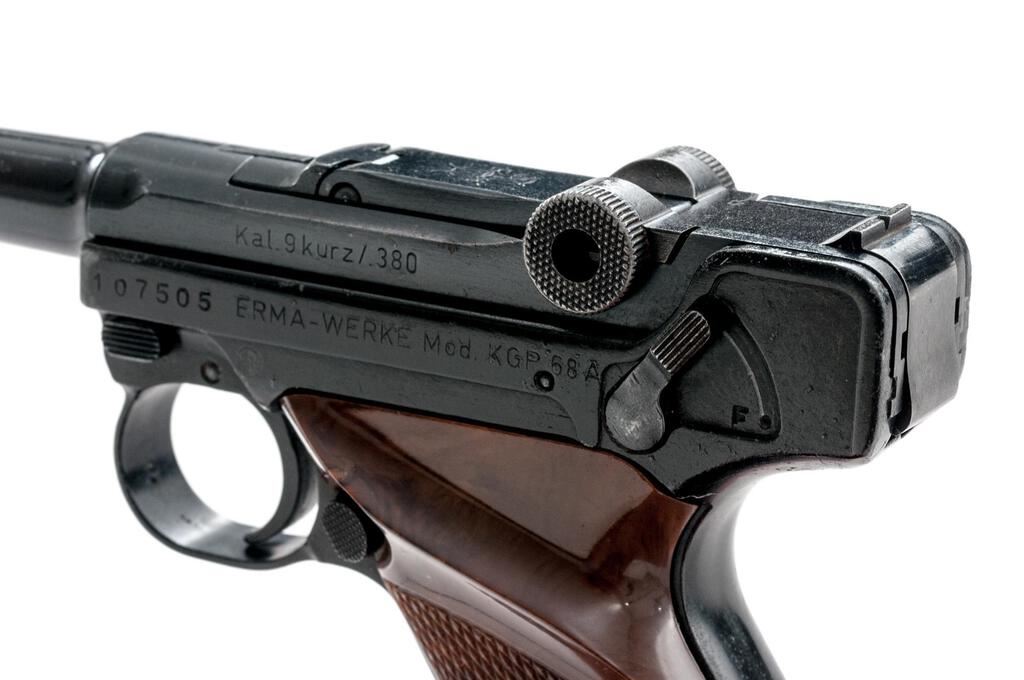 Erma-Werke KGP 68A Semi-Automatic Pistol, #107505, .380 ACP cal., 3.5" barrel, serrated blade front and "V"-notched fixed rear sights, Luger type toggle action, blue finish, checkered plastic two-piece thumb rest grips, and one unmarked magazine. Pistol is in very good overall condition retaining approx. 85%-90% thinning factory finish. There is highpoint edgewear along the frame with thinning of finish and light surface erosion on the barrel. Front and rear grip straps have light scratches and mars. Left side of barrel is marked "Kal 9 Kurz/.380"; left side of frame is marked "Erma-Werke Mod. KGP 68A". There is an Erma emblem atop the toggle (see photo). Right side of barrel is import marked "LA DISTR. New York"; right side of frame is marked "Made in Germany". Grips are good and fit well. Action functions well, bore is good. Est.: $400-$600. (Modern/PPT)