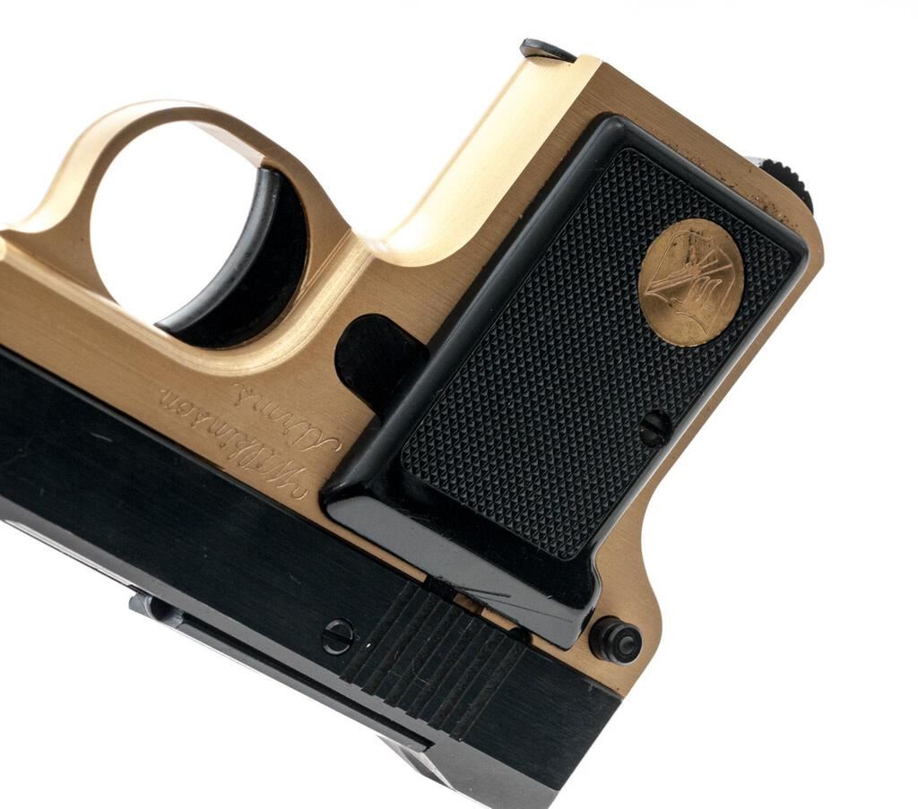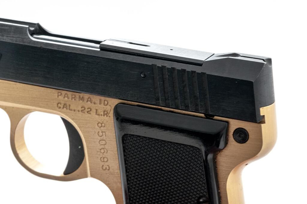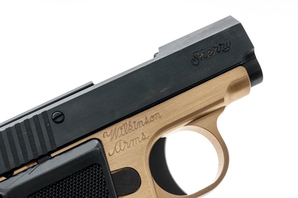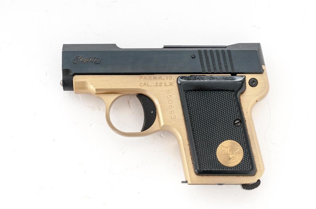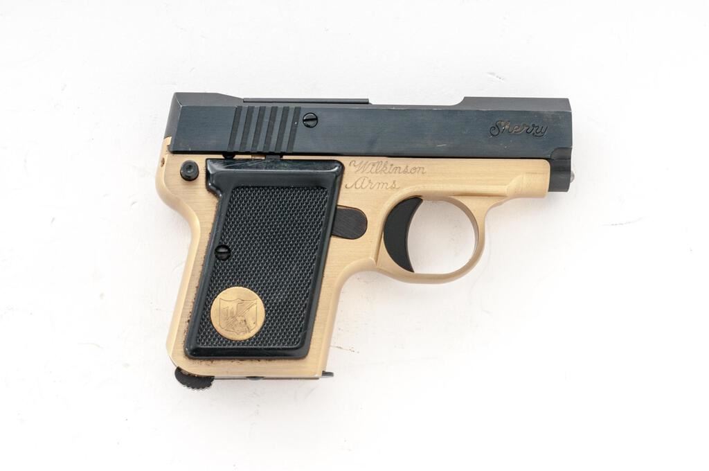 Wilkinson Arms Sherry Model Semi-Automatic Pistol, #850693, .22 LR cal., 2.5" barrel, protected blade front and fixed rear sights, blued machined steel slide, gold anodized aluminum frame, checkered plastic two-piece medallion grips, and one unmarked 8-rd. magazine. Includes a Bianchi 6X suede IWB top snap holster. Gun mfg'd 2000-2005. Pistol is in near excellent overall condition showing little use and only light handling marks. Grips are near excellent as well. Action is crisp, bore is very good. Est.: $300-$500. (Modern/PPT)