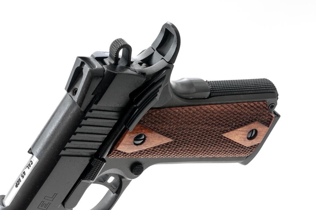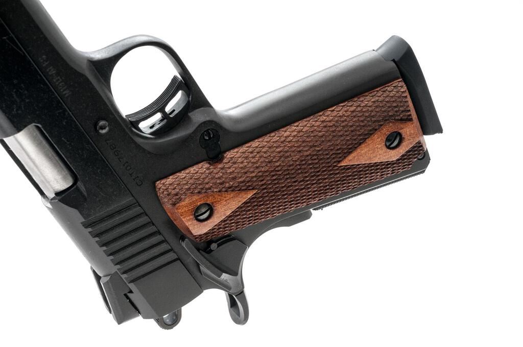 Citadel M1911-A1 FS Semi-Automatic Pistol, #CIT017987, .45 ACP cal., 5" barrel, blade front and square-notched adjustable rear sights, full-length guide rod, black matte Cerakote finish, Hogue two-piece checkered Dymondwood rosewood grips, two 8-rd. Armscor marked magazines with bumper pad, extended slide stop, ambidextrous thumb safety, beavertail grip safety, skeletonized hammer and trigger. Includes a Citadel plastic hard case with two spent cases, manual, and firearms safety literature. Imported by Armscor from 2014-2017. Pistol is as new in the factory case with light handling marks only. Underside of the frame is marked "AF INTL-PAHRUMP NV/PHILIPPINES". The checkered Dymondwood grips are excellent with sharp checkering. Action is crisp, bore is excellent. Est.: $400-$600. (Modern/PPT)