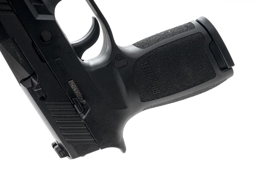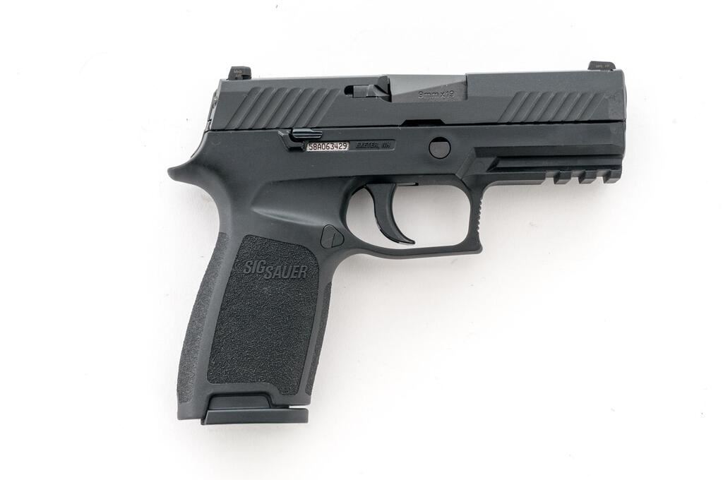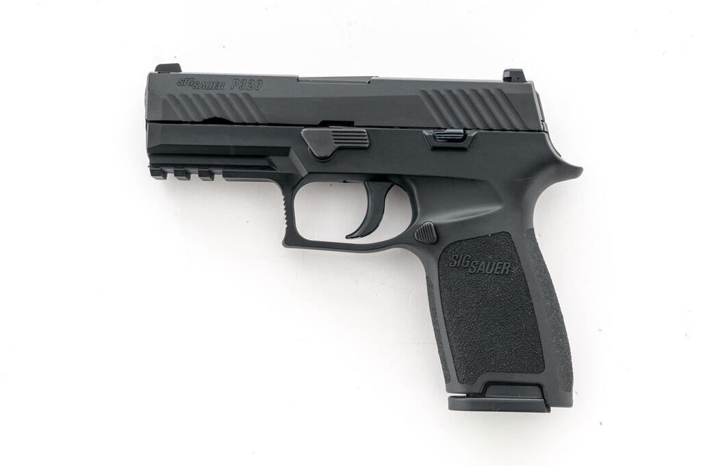 Sig Sauer P320 Carry Semi-Automatic Pistol, #58A063429, 9mm, 3-7/8" barrel, black nitron finished slide, black polymer frame with integral lower accessory rail, 3-dot Siglite night sights, ambidextrous slide release, with two (2) 17-rd. Sig Sauer magazines. In original matching numbered black plastic case with owner's manual, cable lock, and Sig Sauer paddle holster. Condition is excellent, appearing near new. There are a few minor scuffs and handling marks to the frame and slide. Night sights still glow. Smooth like new action. Bore is bright with strong rifling. Est.: $350-$500. (Modern) (Not available to Calif. residents.)