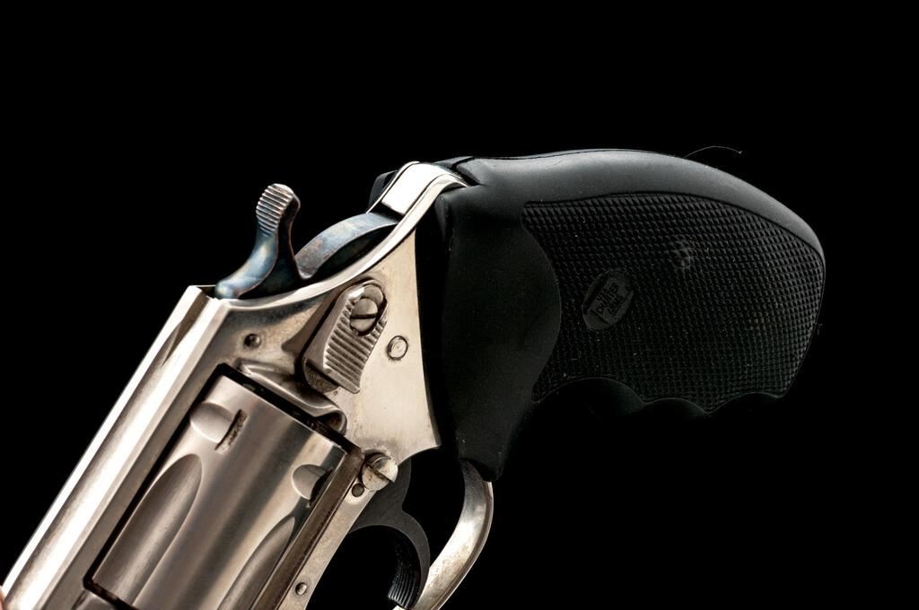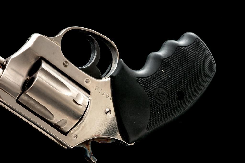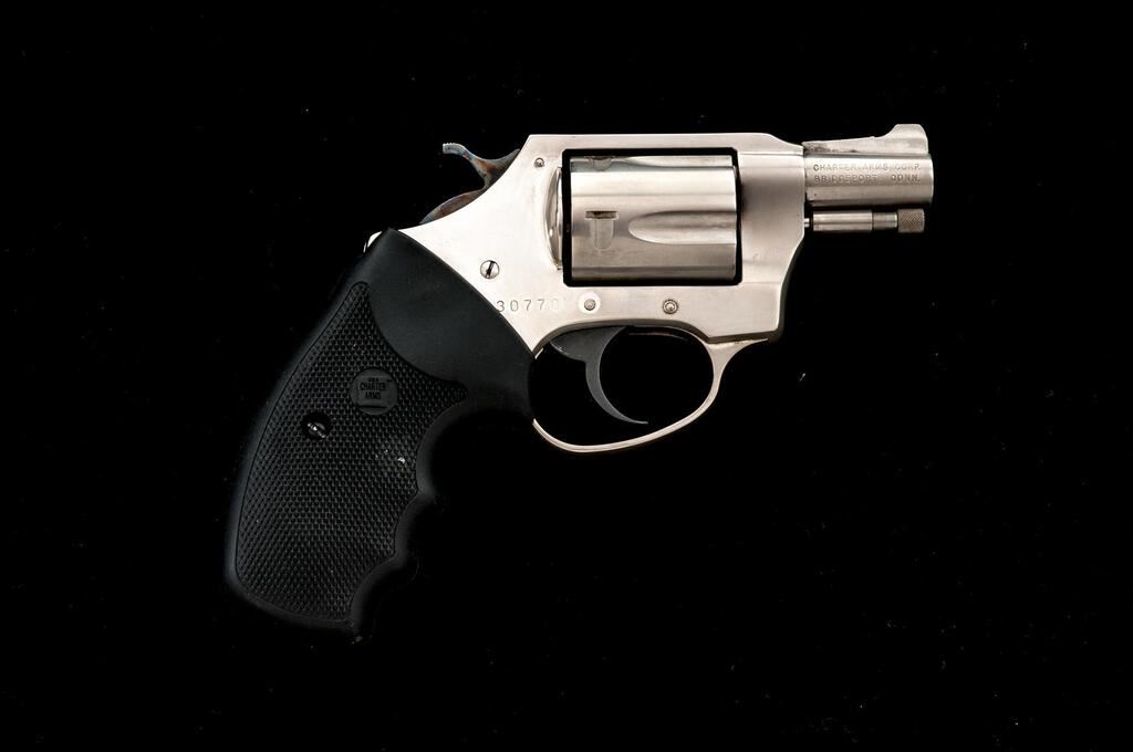 Charter Arms Undercover Double Action Revolver, #30770, .38 Spec. cal., 2" barrel, ramped blade front and square-notched fixed rear sights, stainless steel, checkered rubber one-piece Charter Arms marked combat grips, and 5-shot cylinder. Revolver is in fine overall condition retaining nearly all of its factory finish, with small mars and scuffs consistent with carry and use. Cylinder shows an index line, and the finish is frosting ahead of the cylinder from use. Hammer shows muted case coloring. Grips are very good and fit well. Action works well, bore is very good with sharp rifling. Est.: $200-$400. (Modern/PPT)