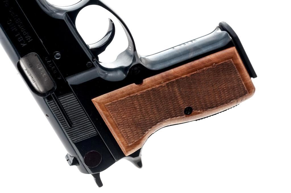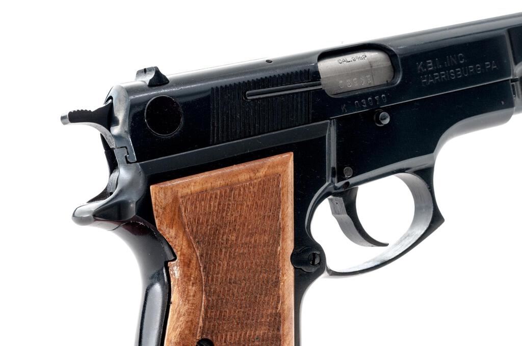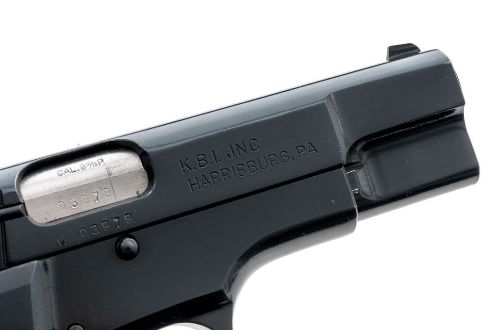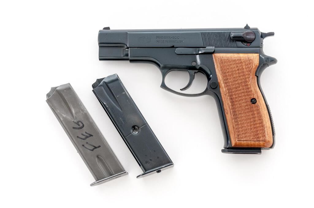 FEG Model GKK-92C DA Semi-Automatic Pistol, #K03979, 9mm, 4" barrel, blade front and "U"-notched fixed rear sights, blue finish, spur hammer, checkered wood two-piece grips, 10-rd. detachable magazine. Lot includes a total of three (3) magazines. Left side of slide is marked "MADE IN HUNGARY"; right side is import marked "K.B.I. INC./HARRISBURG, PA". Pistol is in near excellent overall condition retaining approx. 97%-98% original finish, with handling marks and small mars on the trigger guard. Checkered wood grips are excellent with sharp checkering. Action is crisp, bore is very good. Est.: $400-$600. (Modern/PPT)