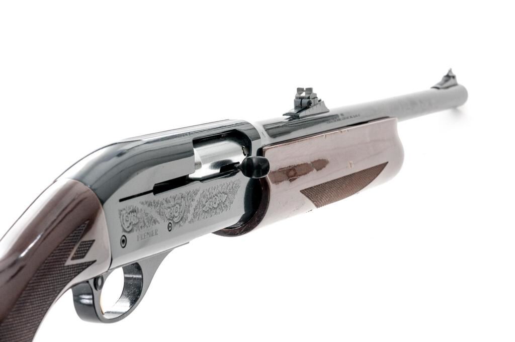Remington Model 11-87 Premier Deer Gun Semi-Automatic Shotgun, #PC651247. 12 ga. 21" plain barrel has a 3" chamber and is fitted with rifle sights and Rem chokes (rifled tube installed). Action is standard 11-87 but has later engraving pattern on the receiver. The finger-groove forend and pistol grip buttstock are high-gloss walnut and include a special checkering pattern, with Remington grip cap and solid recoil pad. Mfg'd approx. 1990. Condition is near excellent, as carried and shot very little. Action snaps closed tightly and functions correctly; bore is mirror bright. Est.: $400-$550. (Modern)